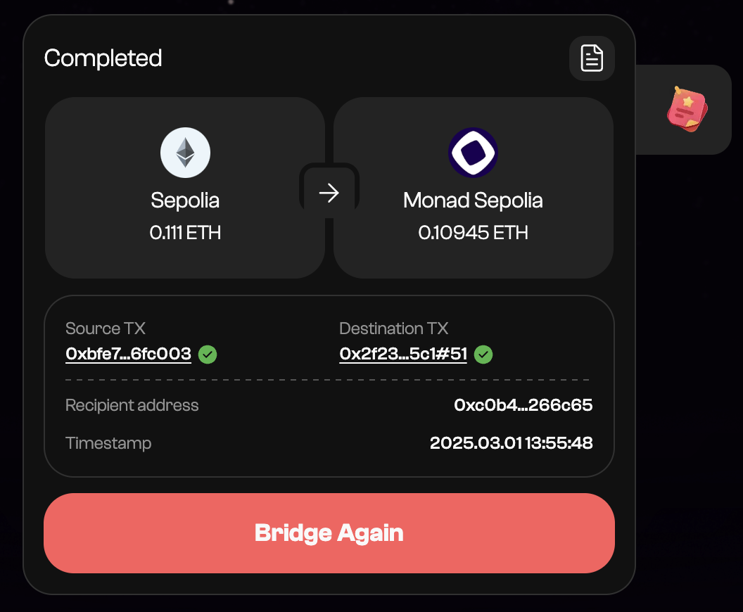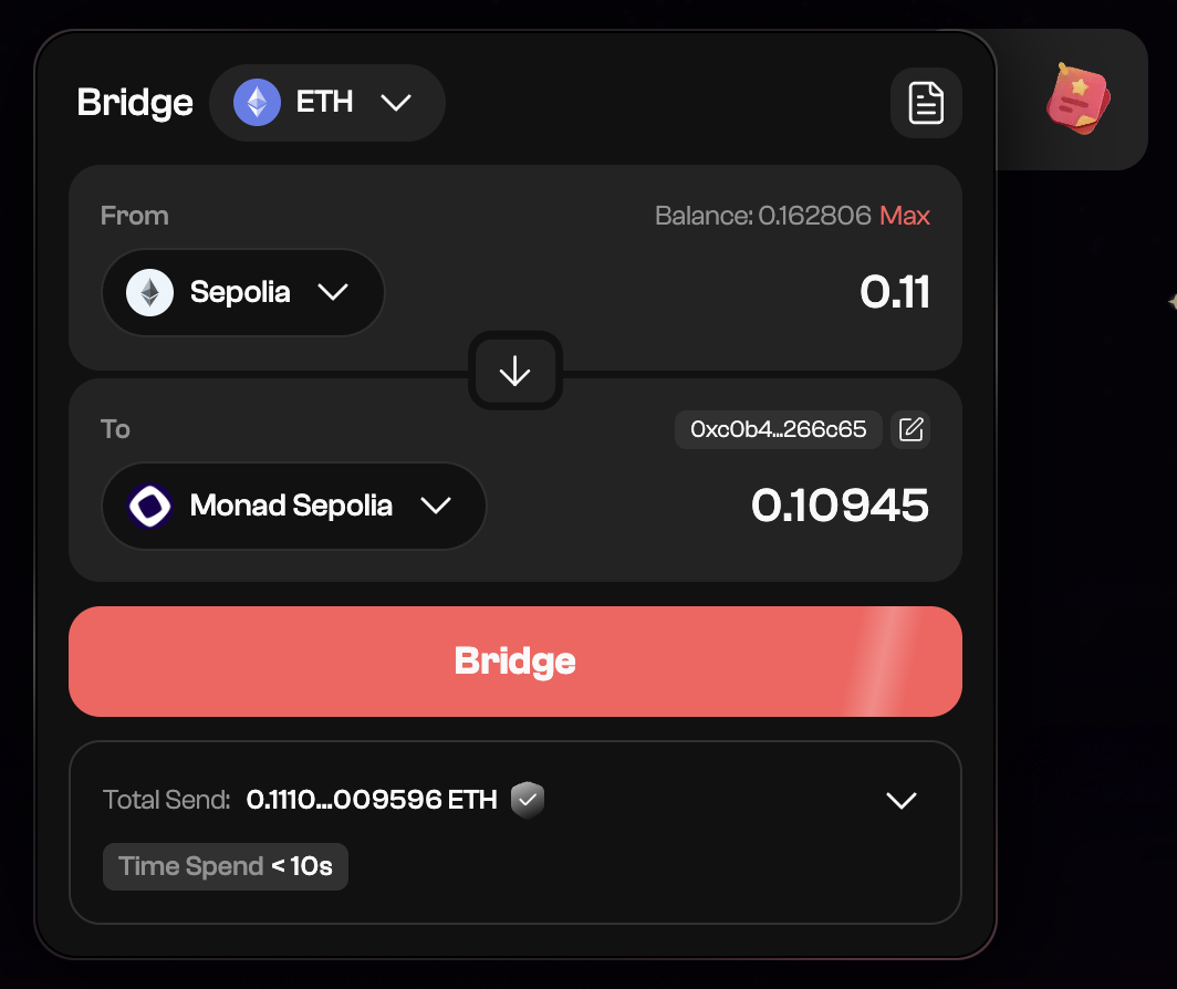 Set "From" as Sepolia and set "To" as Monad Sepolia, insert any available amount & hit Bridge.