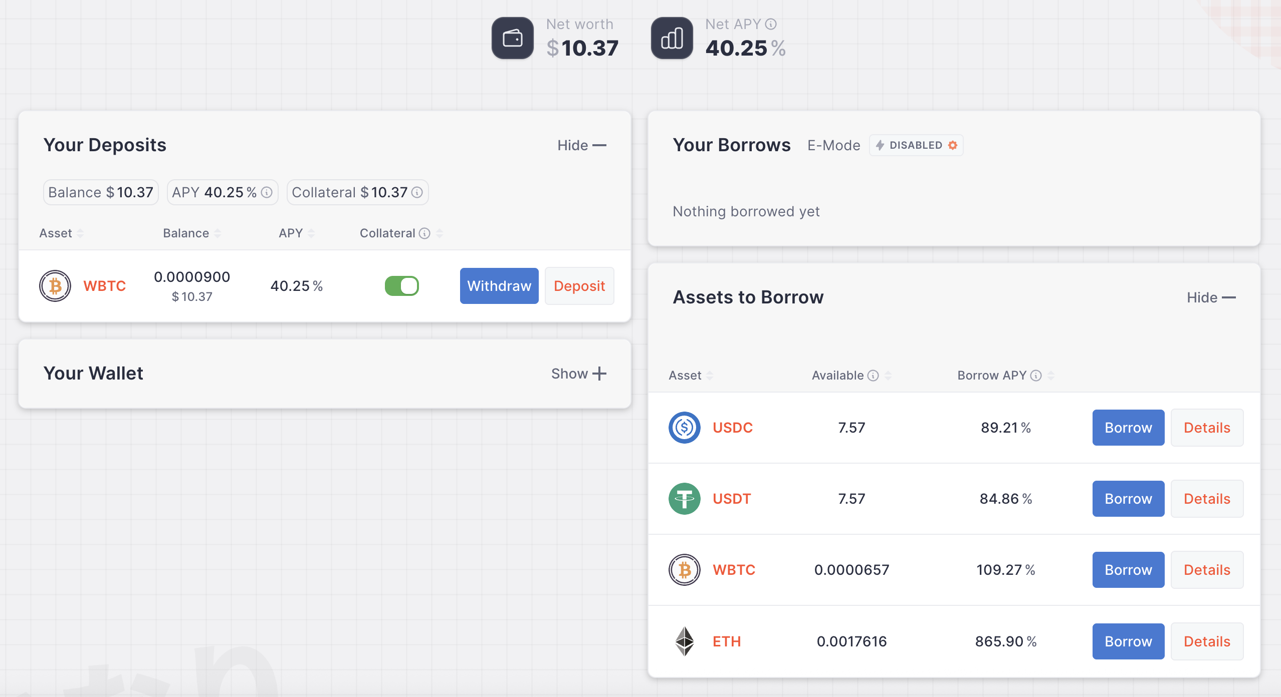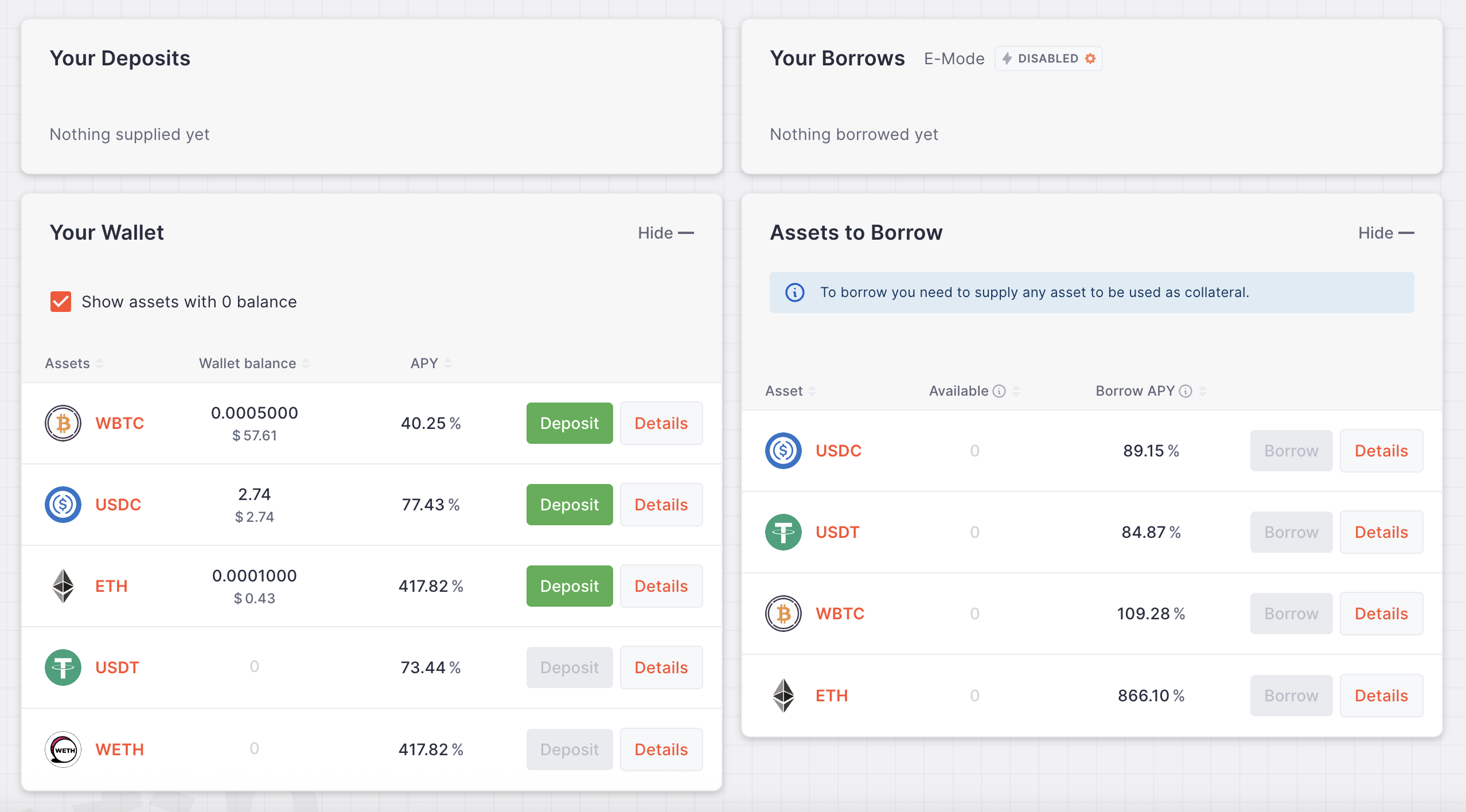 Now you should see your deposit on the left, and on the right you'll now see that we can Borrow assets by using our wBTC as collateral.