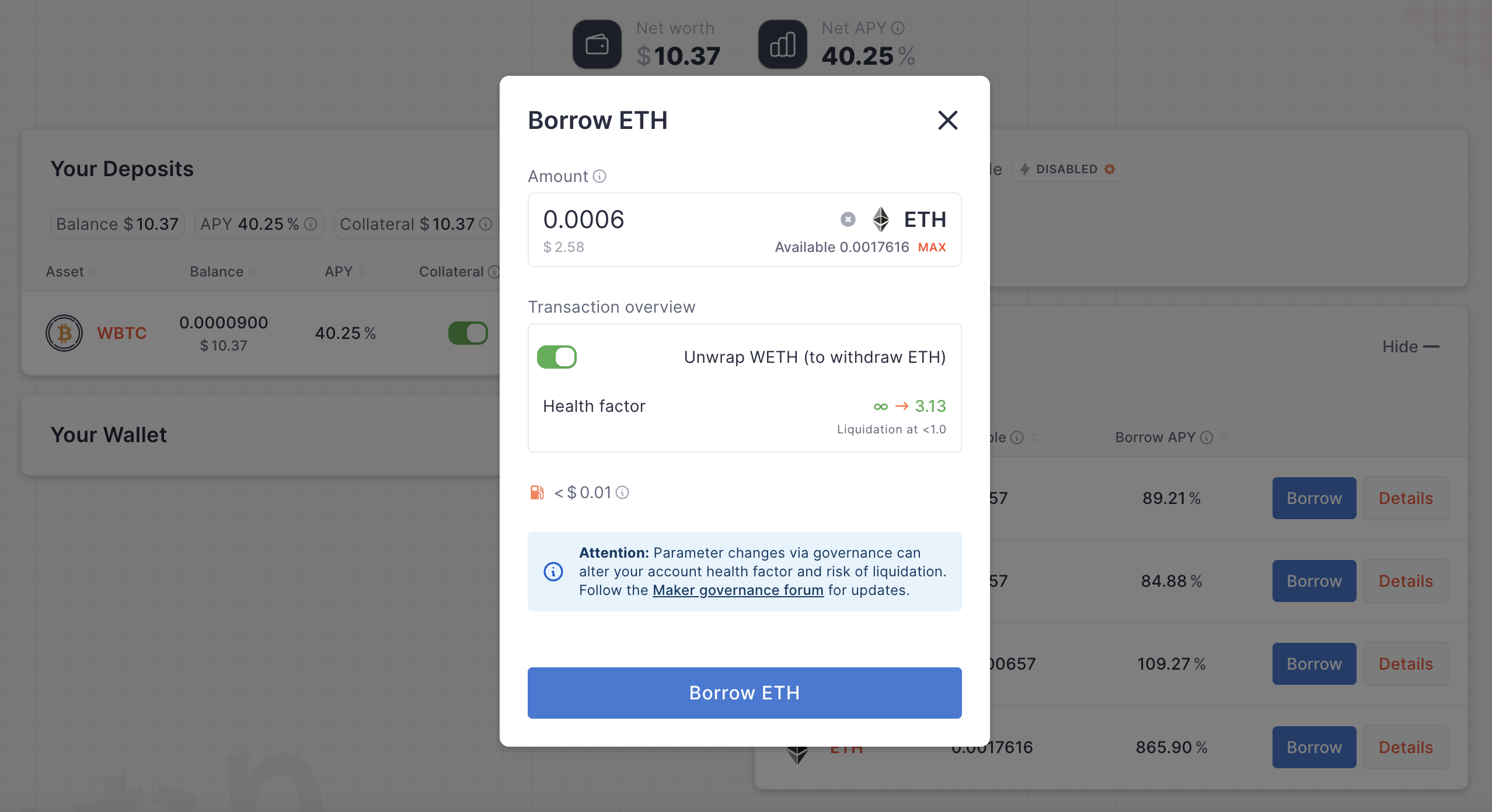 Press Borrow on any asset (I will select ETH for this guide).