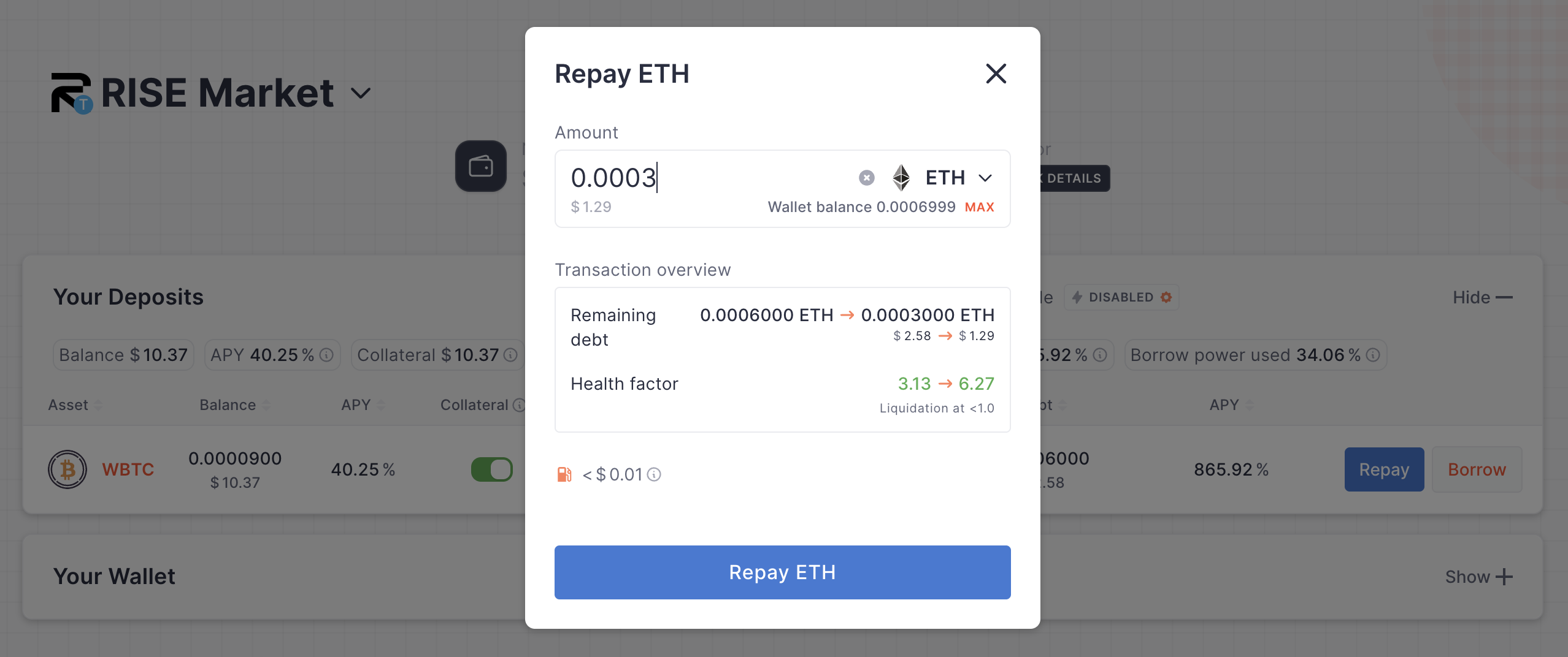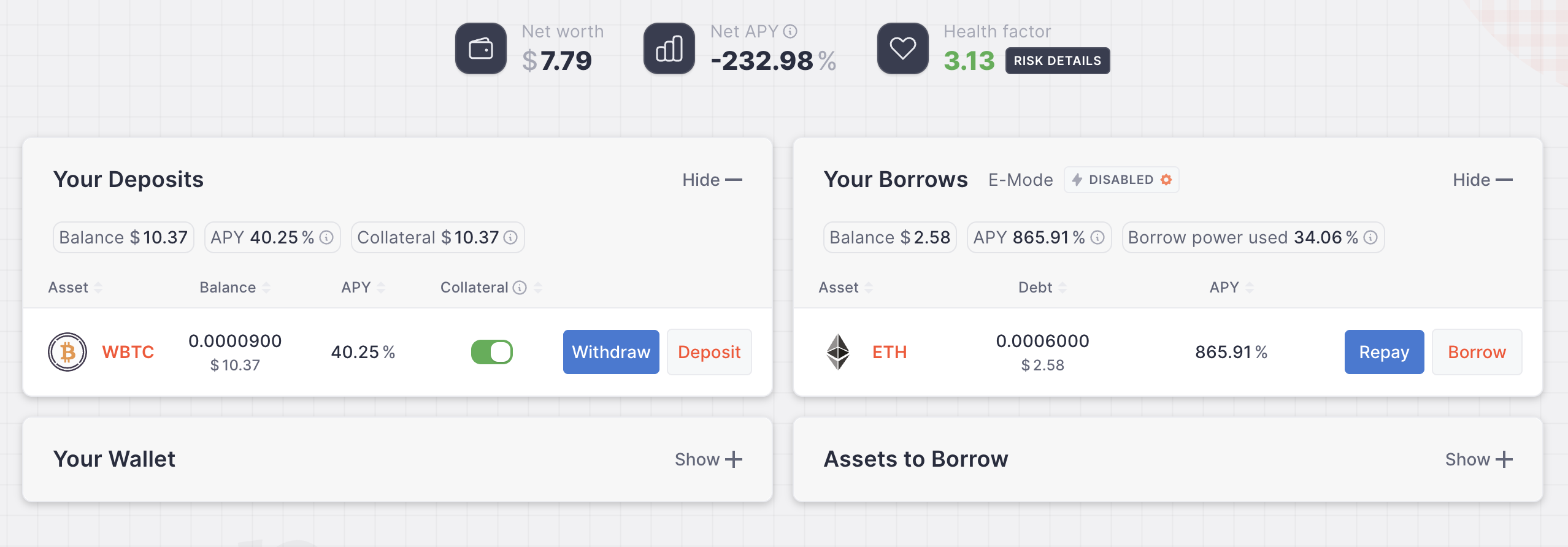 If your Health Factor is a little low you can repay some of the Borrow by pressing Repay.