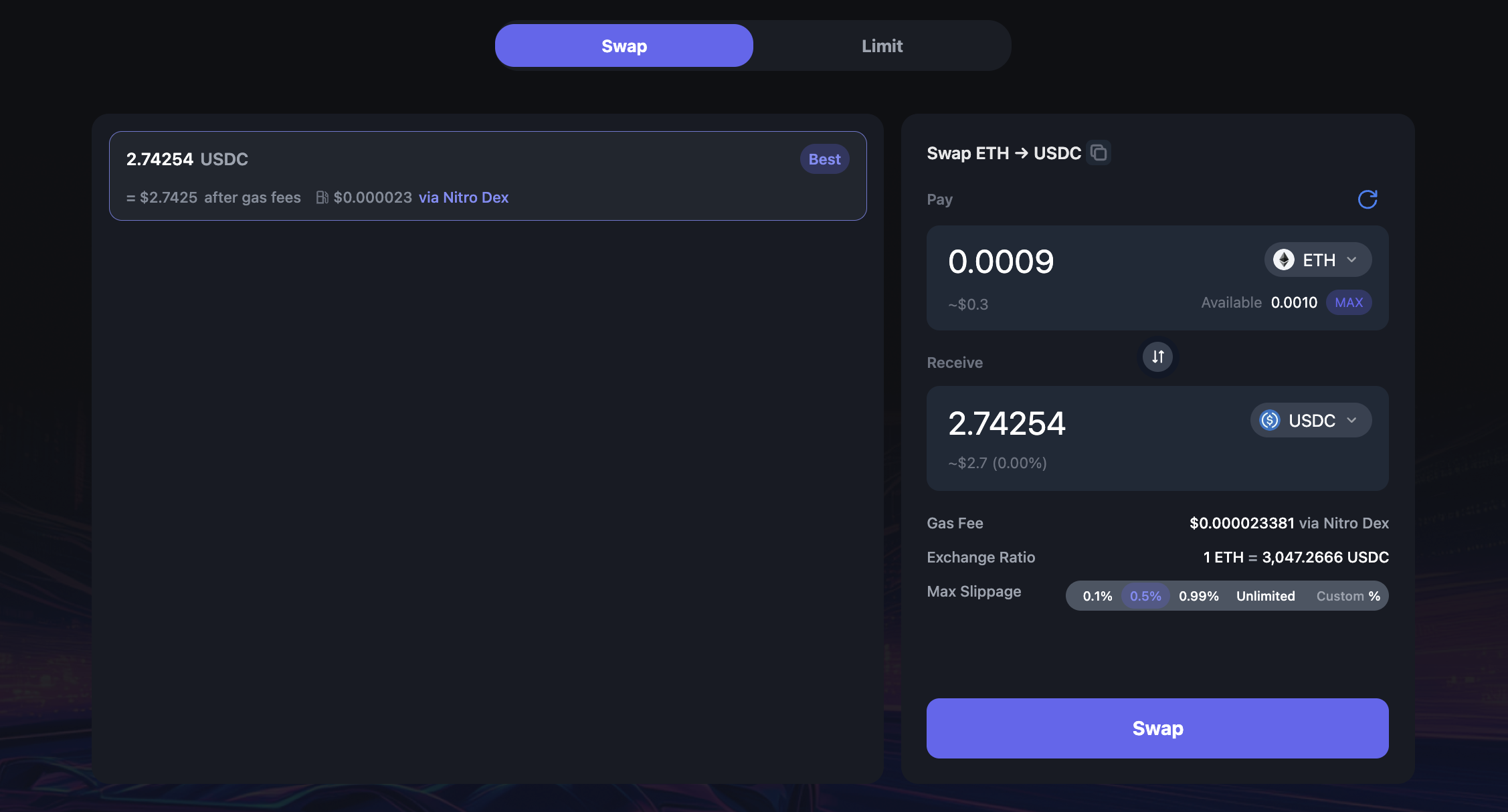 Now let's perform some swaps, head to: nitrodex.xyz, insert any amount of any available token, Approve, Review and Swap.