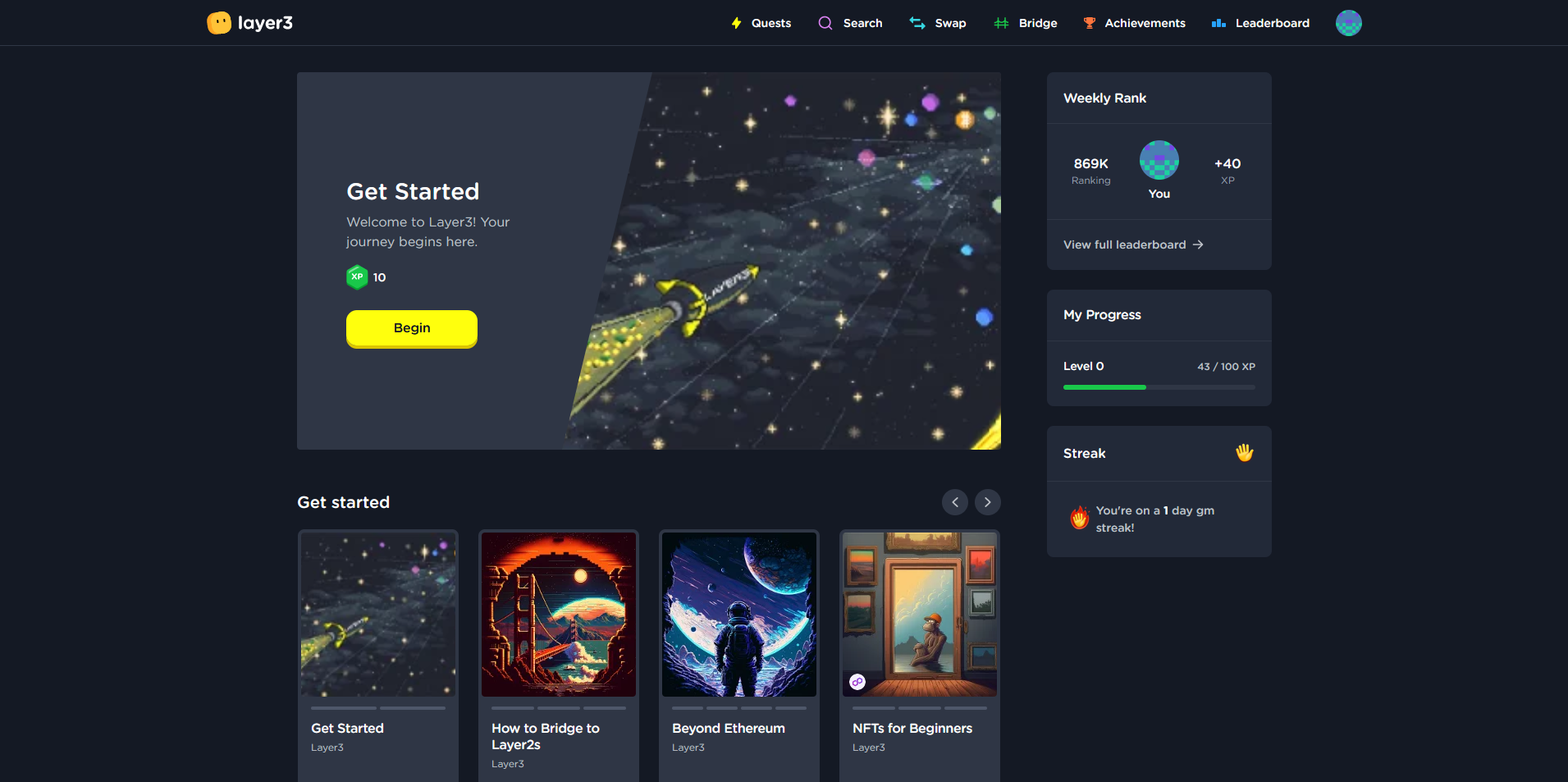 Layer3 stands as a captivating web3 educational platform, designed to empower individuals in their exploration and understanding of web3 technology. It provides a unique approach to learning by incorporating "checkpoints" in the form of bounties, offering an engaging experience that fosters community growth.