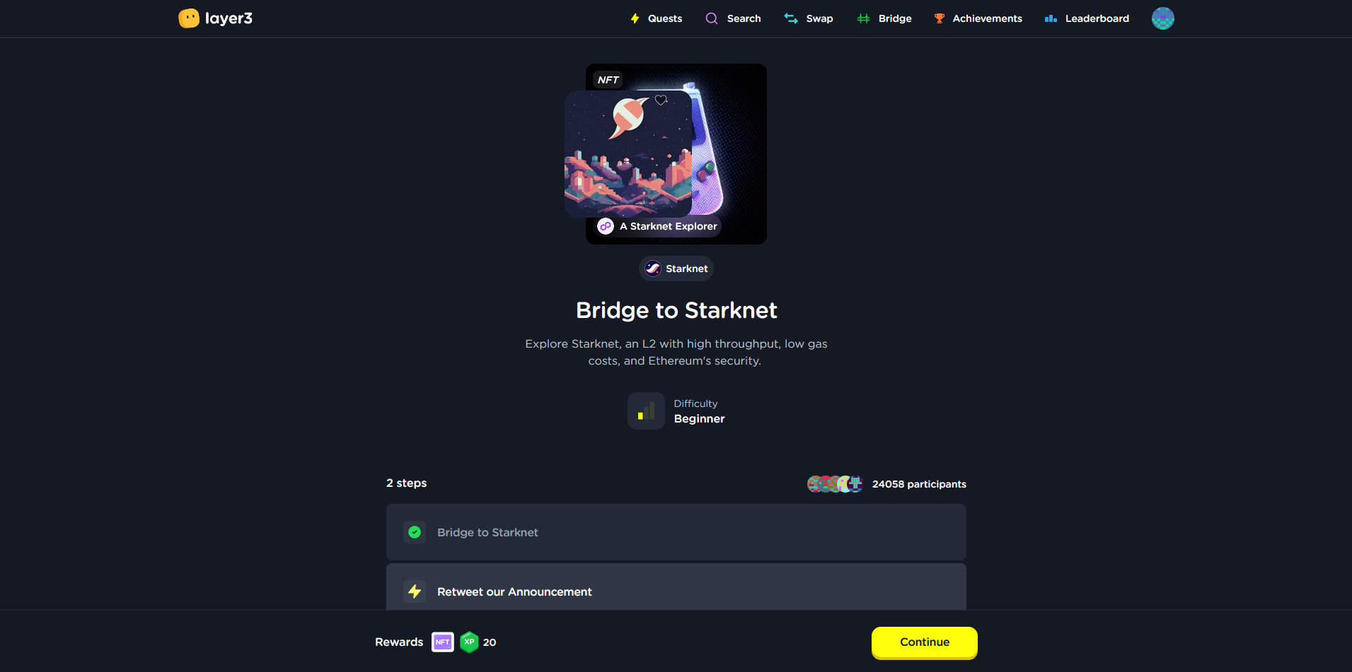 Now we can begin the quest, let's start off with the first step: layer3.xyz/quests/bridge-to-starknet