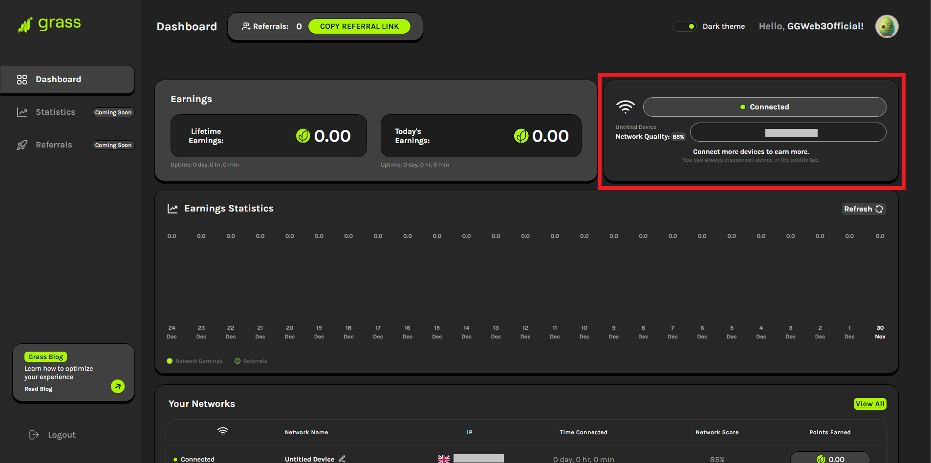 Now we should see that our network is connected & we have started earning rewards already!