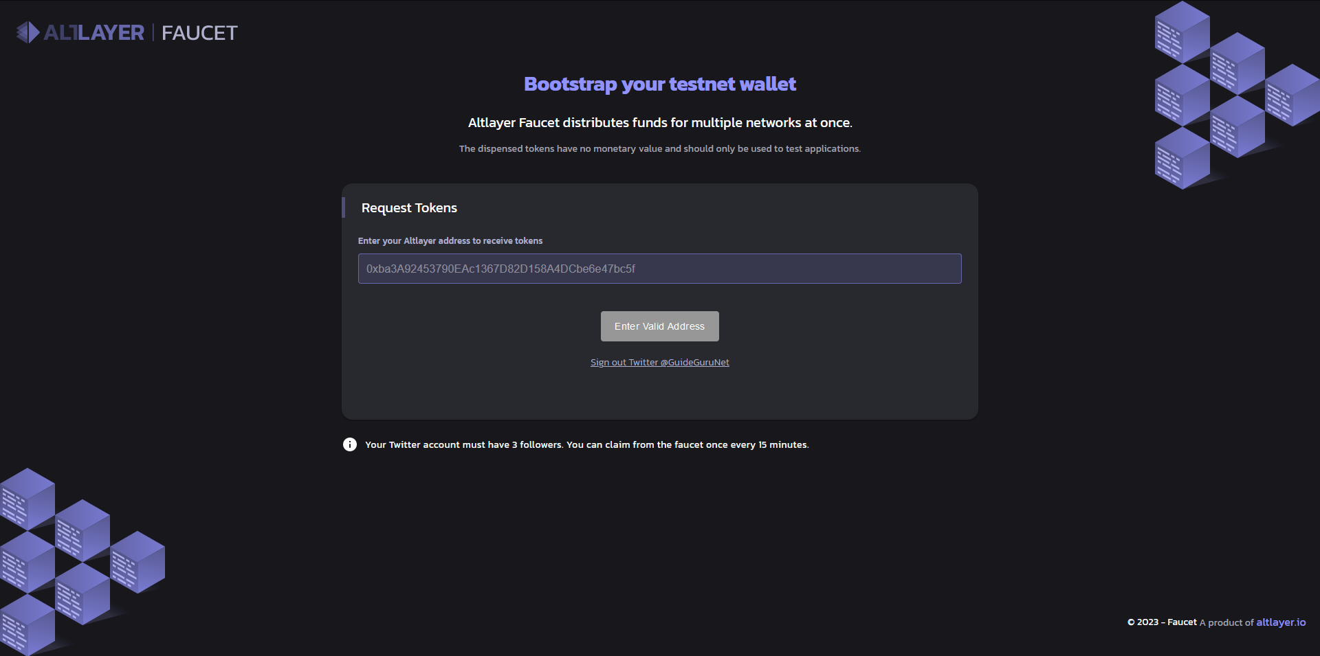 Now go to testnet-faucet.altlayer.io, insert your wallet address & hit "Claim".
