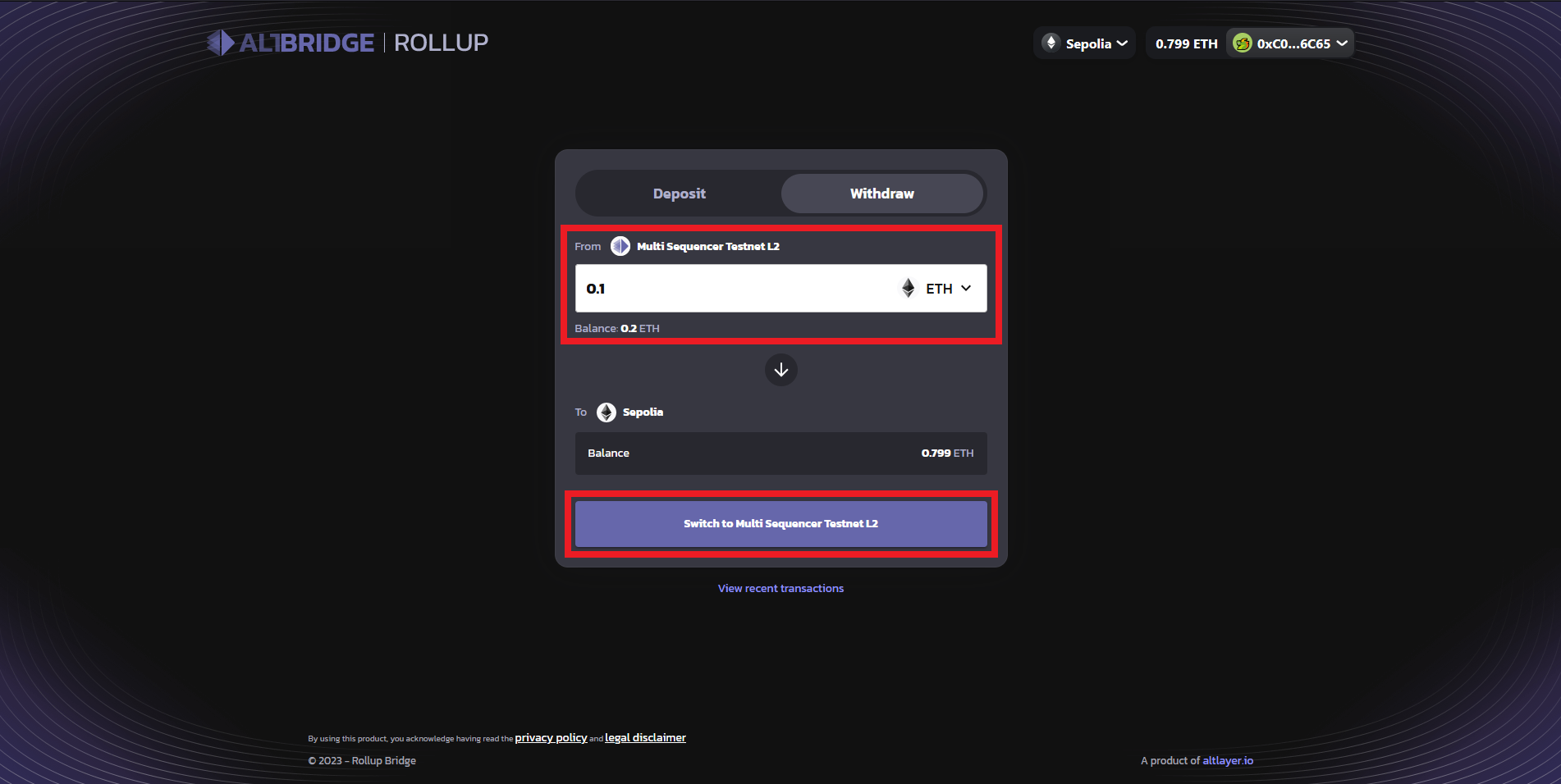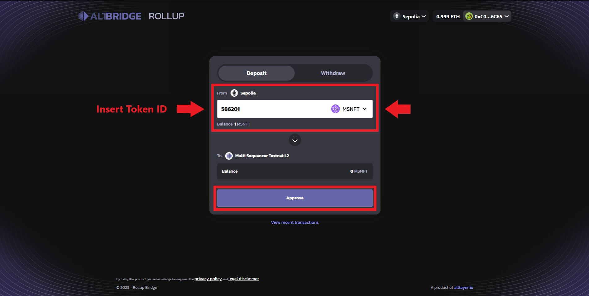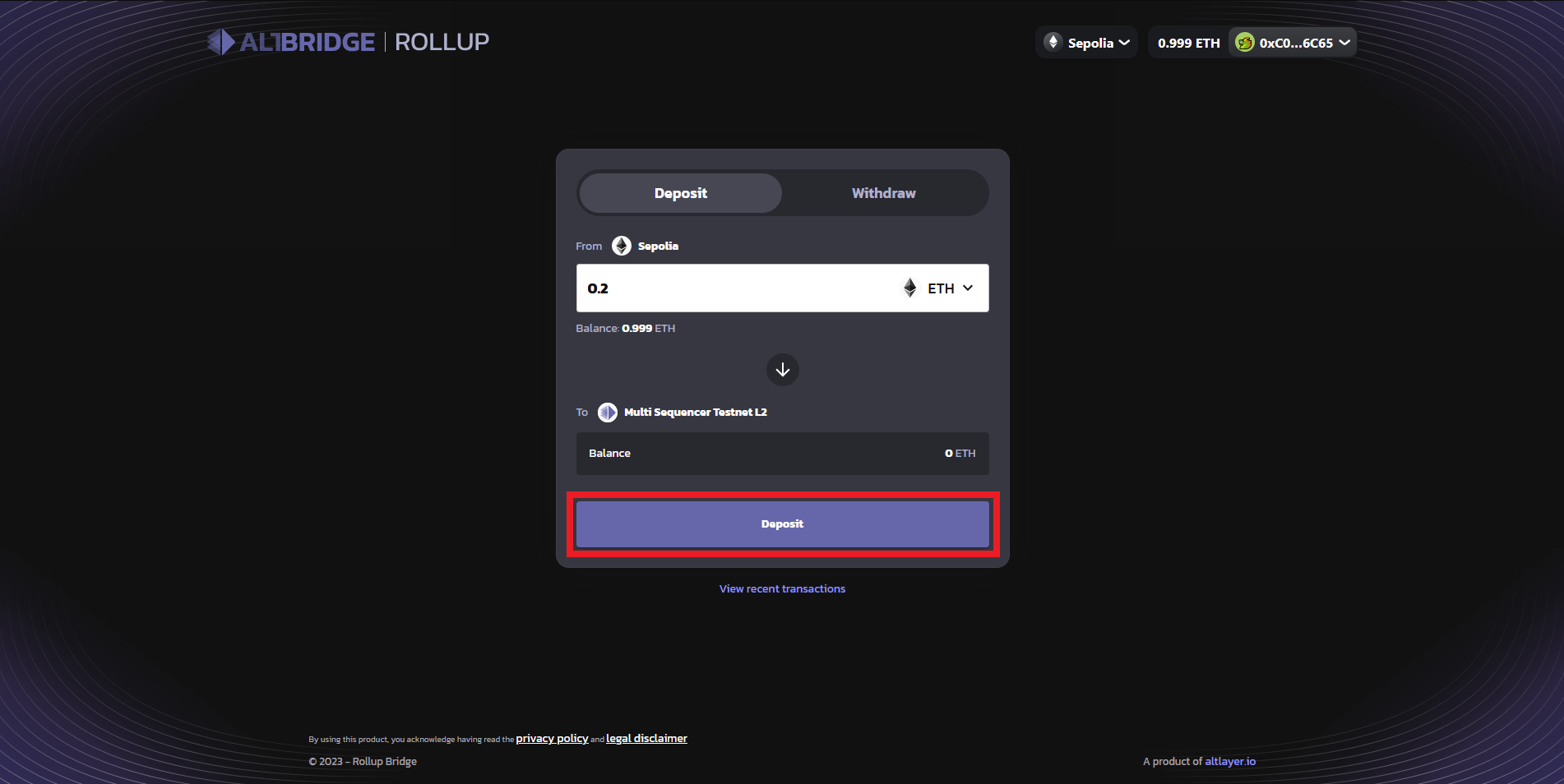 Go to testnet-rollup-bridge.altlayer.io/deposit & connect your wallet.