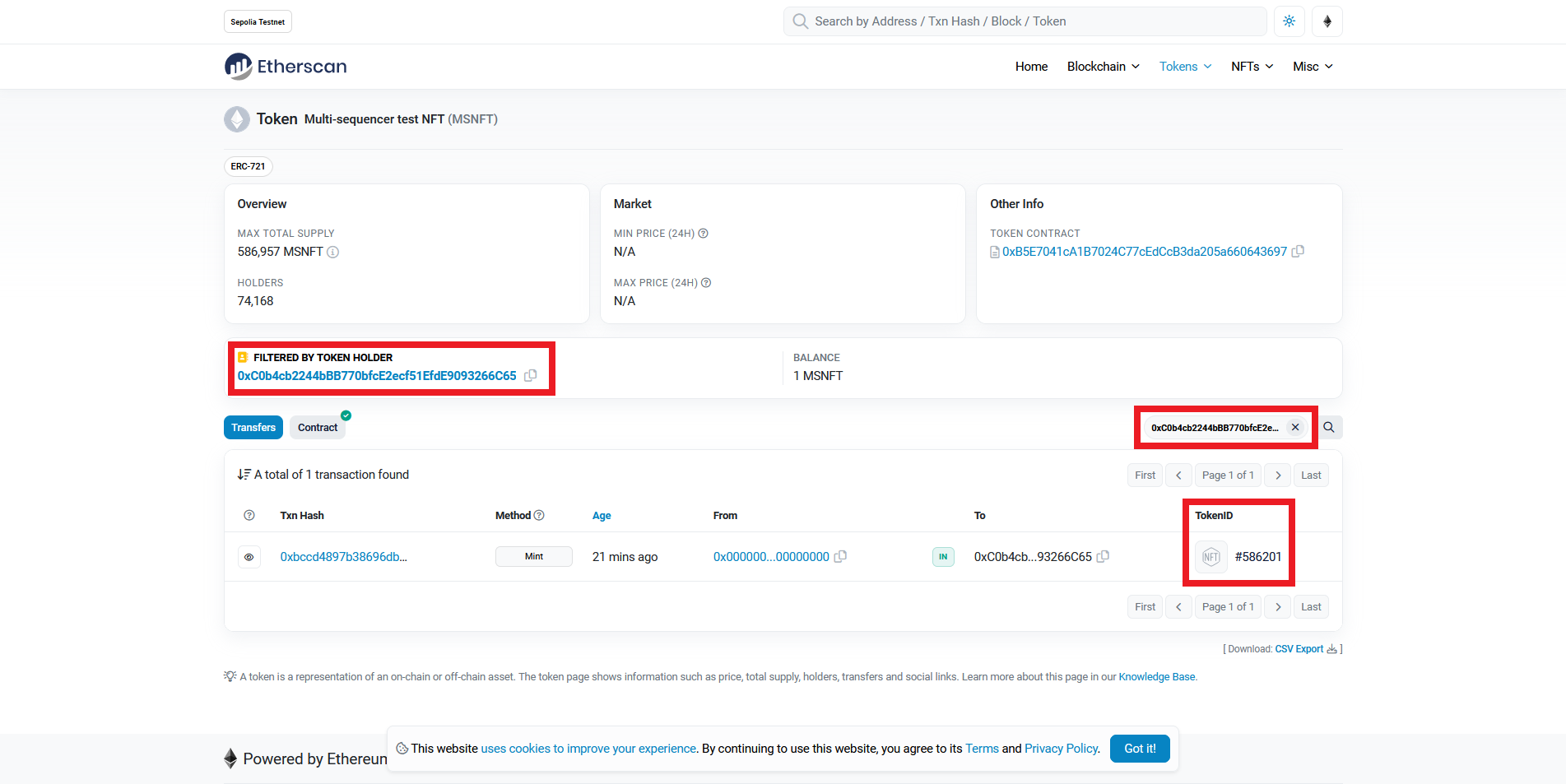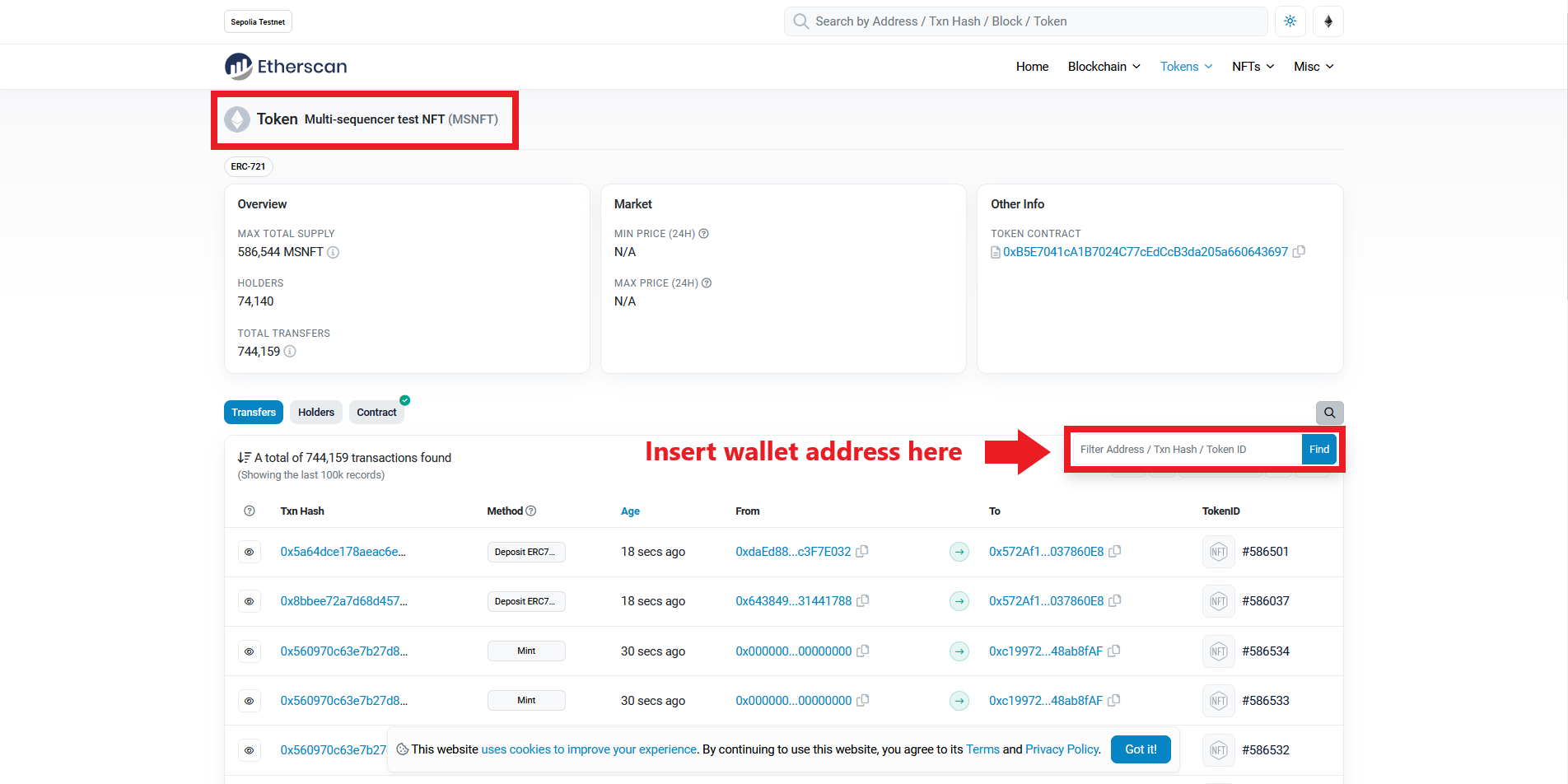 To locate the TokenID, You need to go to sepolia.etherscan.io & insert your address into the search icon (as seen in images below).