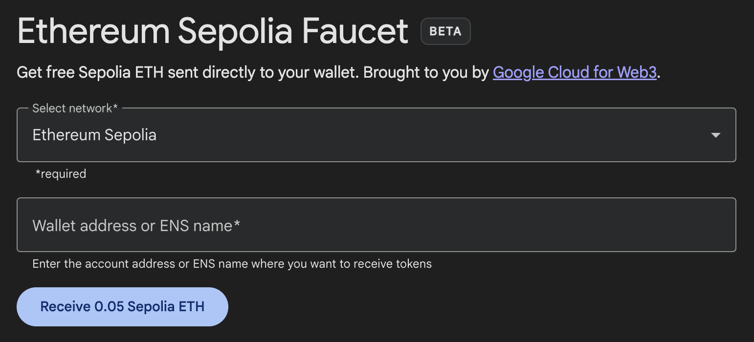 First we need to claim some test ETH on Sepolia. Input your wallet address and claim.