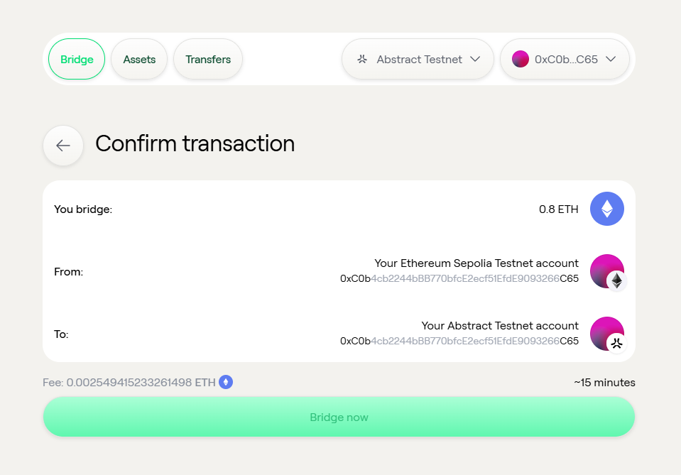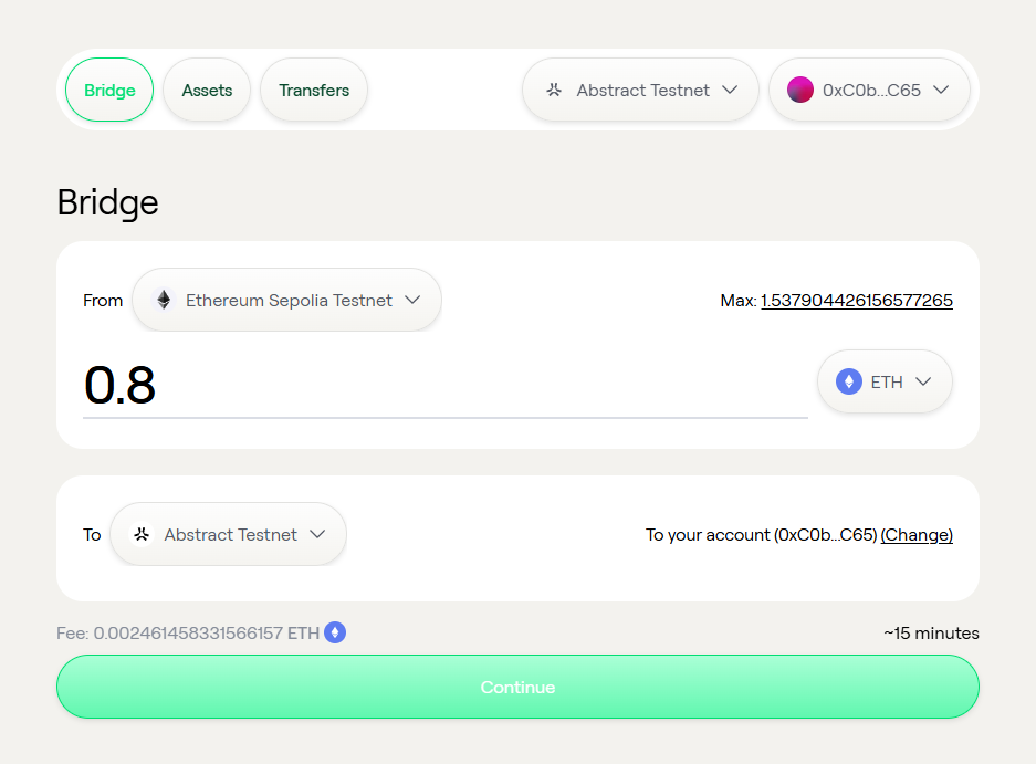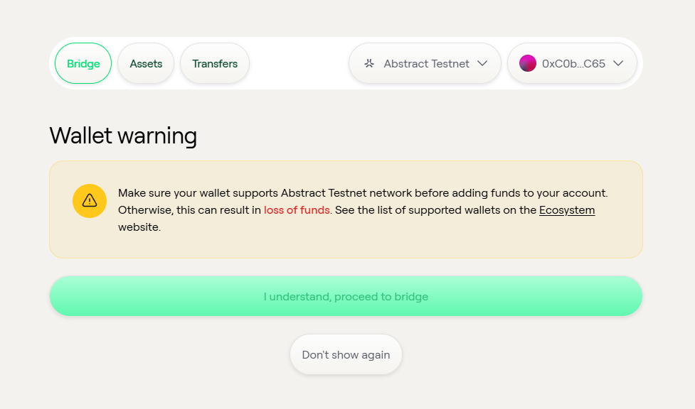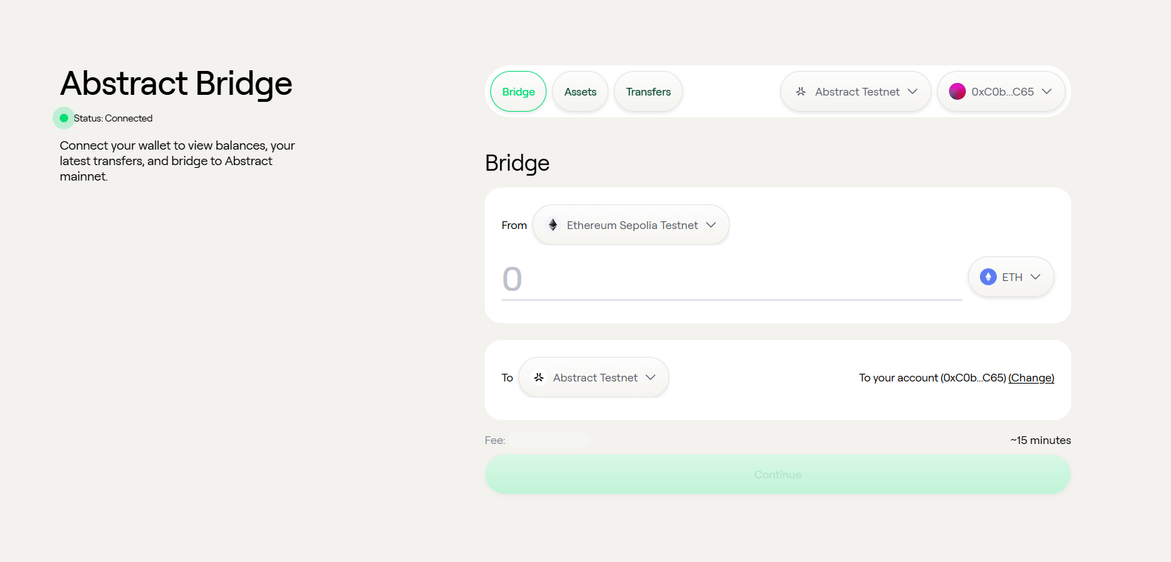 First, we just need to head over to the bridge: portal.testnet.abs.xyz/bridge & connect wallet.