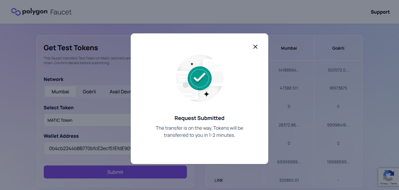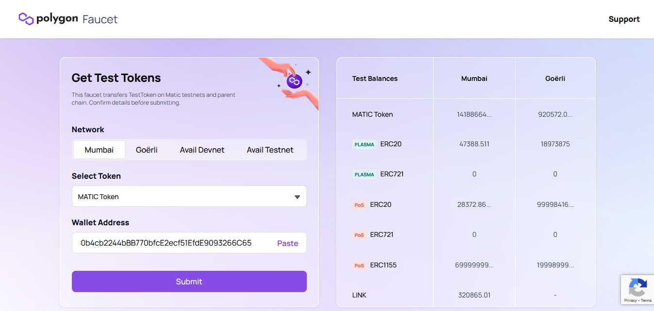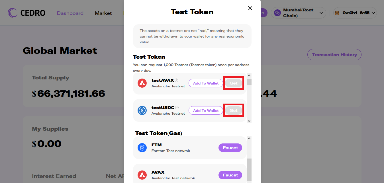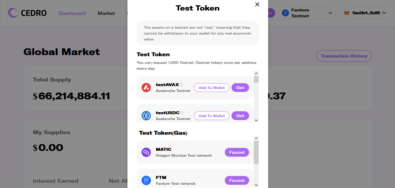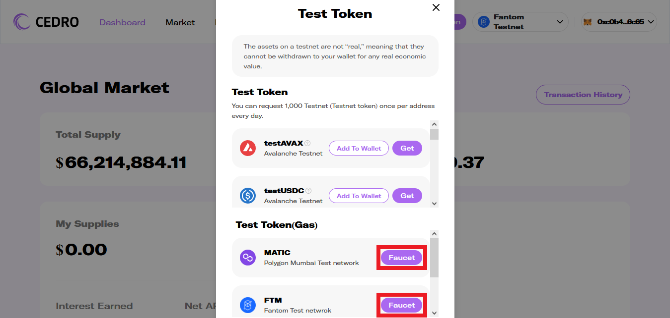 - If you receive an error saying you don't have enough for Gas Fee's, just select "Get Test Token" at the top of the page & claim some more from the "Faucet" buttons.