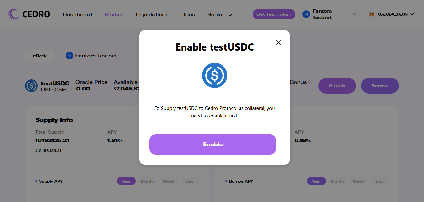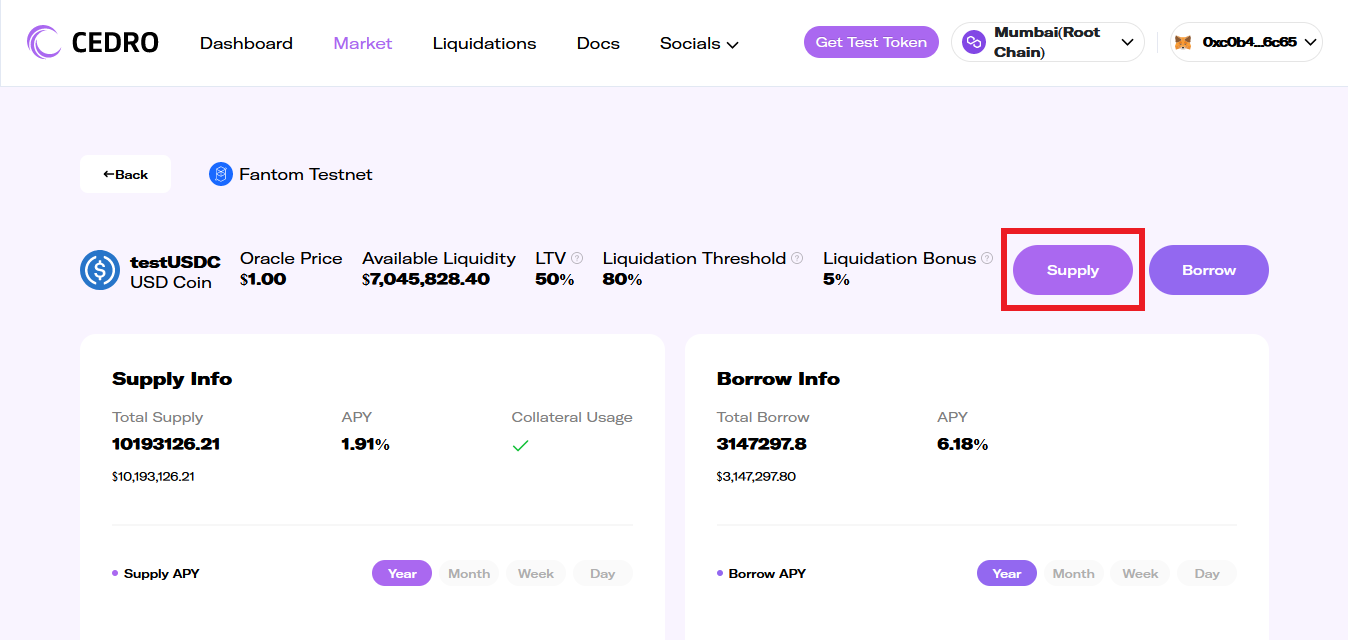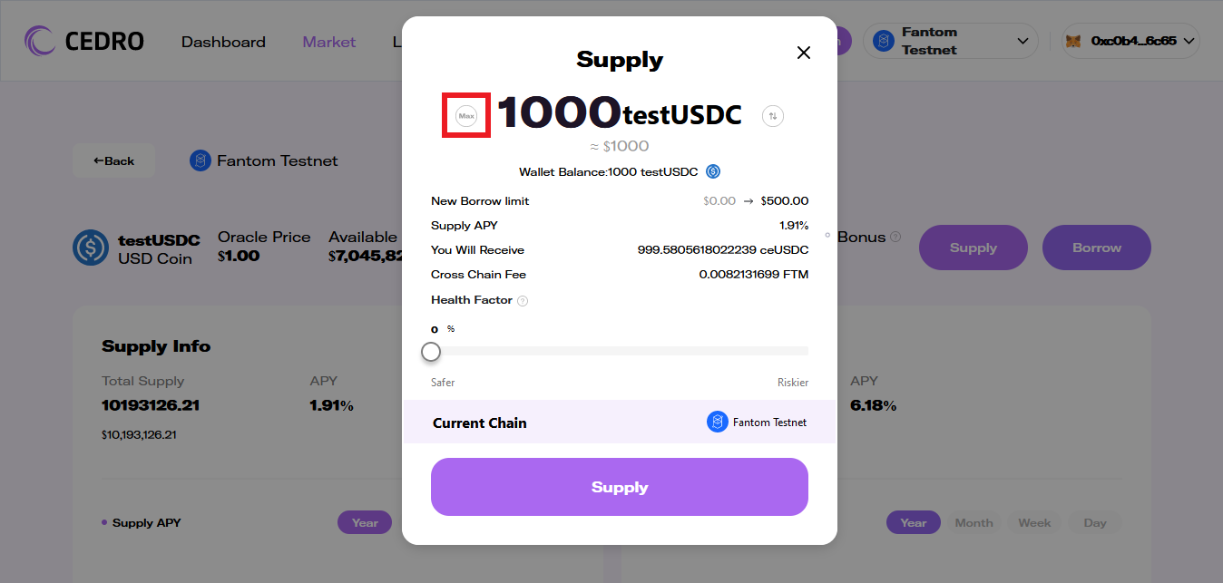 Now press "Supply" again, select "MAX" to input the full amount (1000testUSDC) & hit "Supply".
