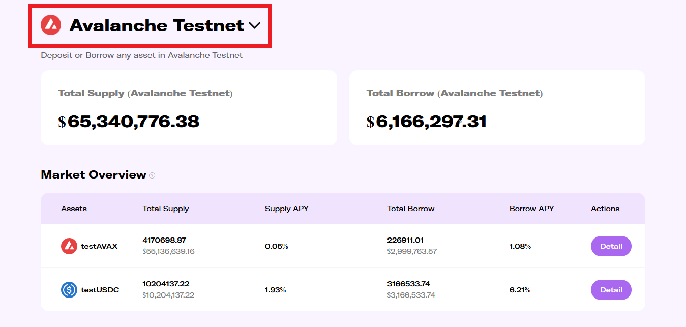 To repeat the previous step for all tokens, go to the "Market" tab again, but this time select the dropdown and switch network to "Avalanche Testnet".