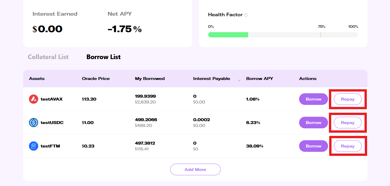 So select "Repay", input any amount & repay, do this for all the test tokens you borrowed.
