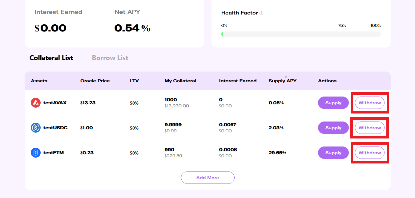 Go to Dashboard, scroll down & select "Collateral List" & click "Withdraw", input any amount & hit "Withdraw", do this for each token.
