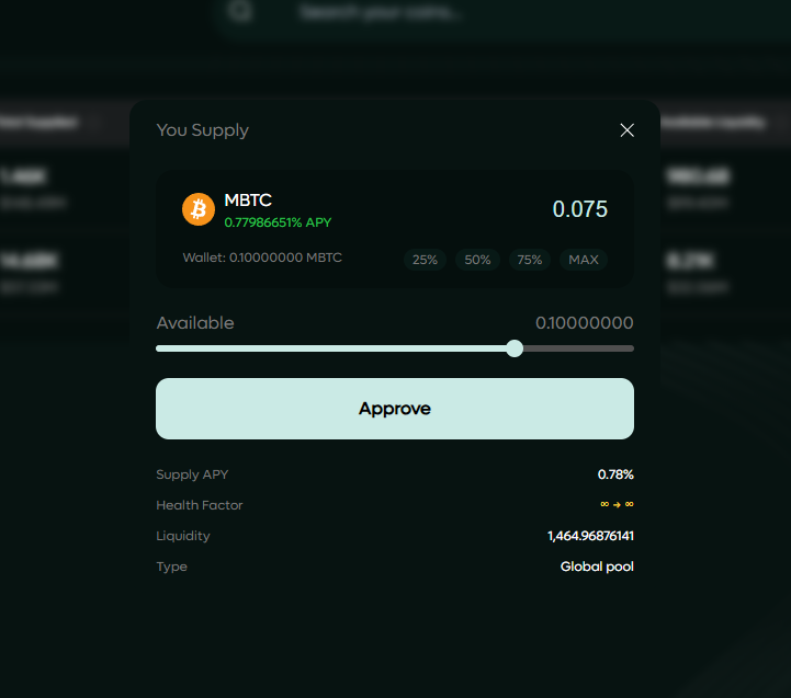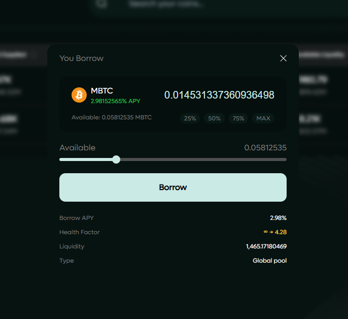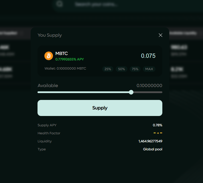 Once approved, press "Supply" again for MBTC, Insert the same amount and press "Supply".Now go back to the Markets page and press "Borrow", and again insert an amount, then press "Borrow".