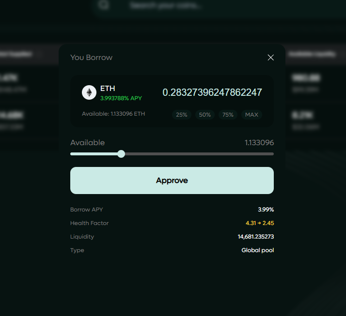Now go back to the Markets page and this time press "Borrow", and again insert an amount, then press "Borrow".