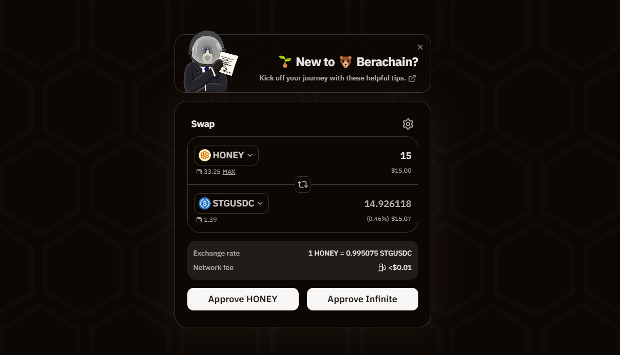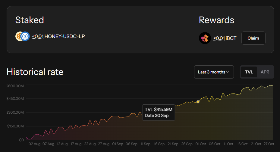 Press the balance to insert the full amount, then Approve tokens, and fnally hit "Stake HONEY-USDC-LP" button to stake them.