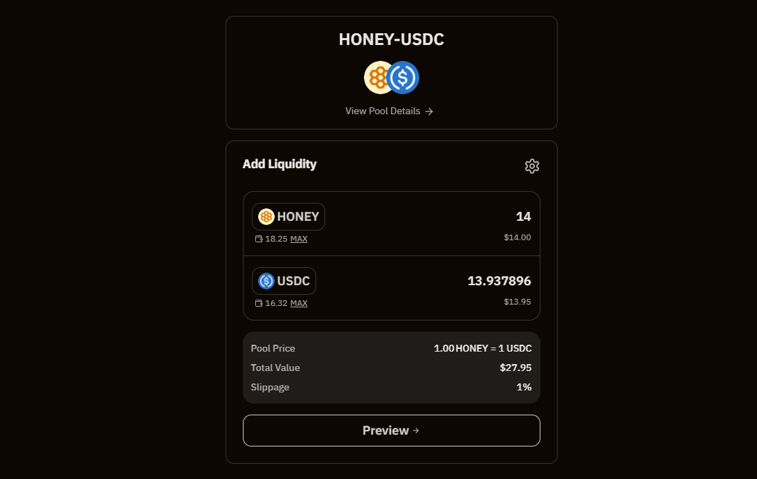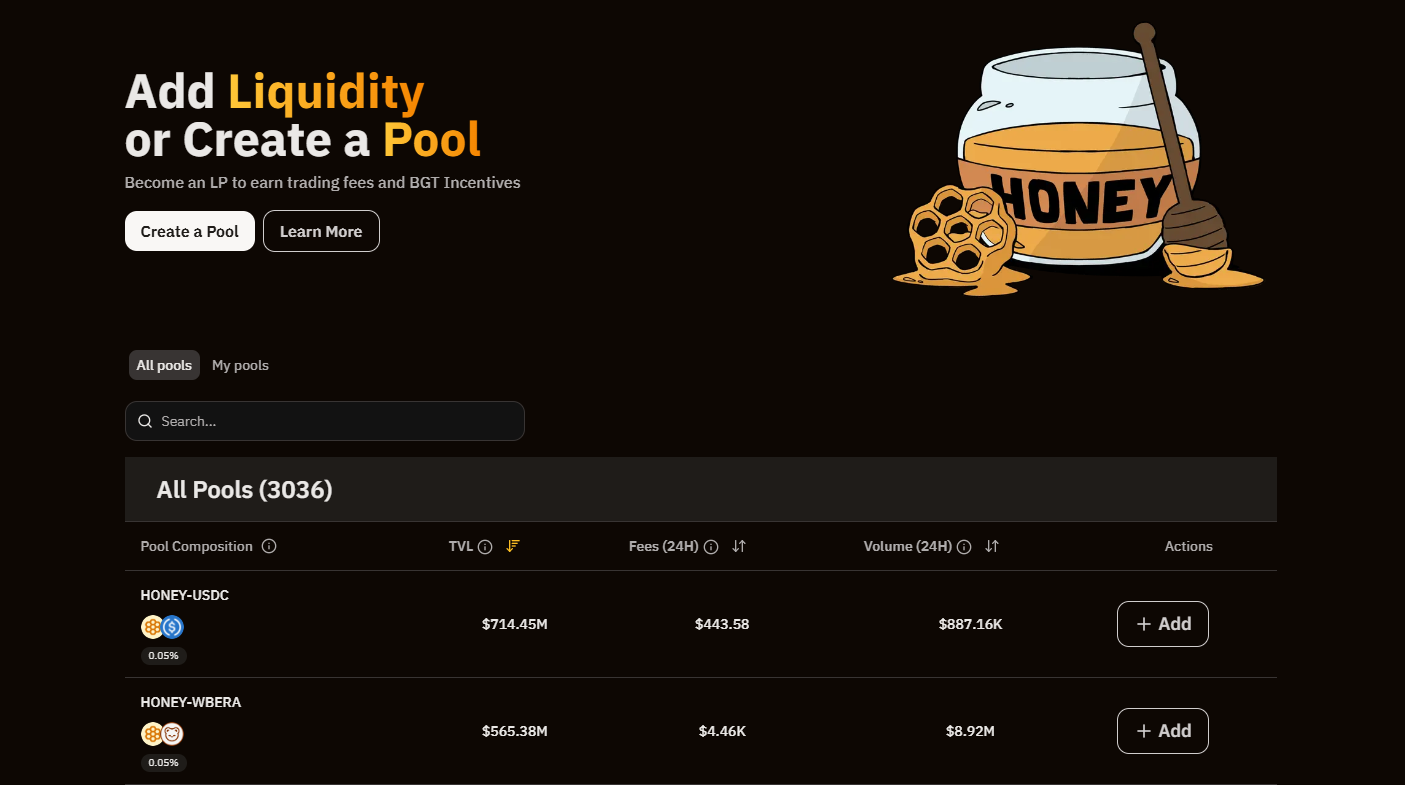 To do this, we need to add our HONEY & STGUSDC tokens to a Pool which you can find here: bartio.bex.berachain.com/pools