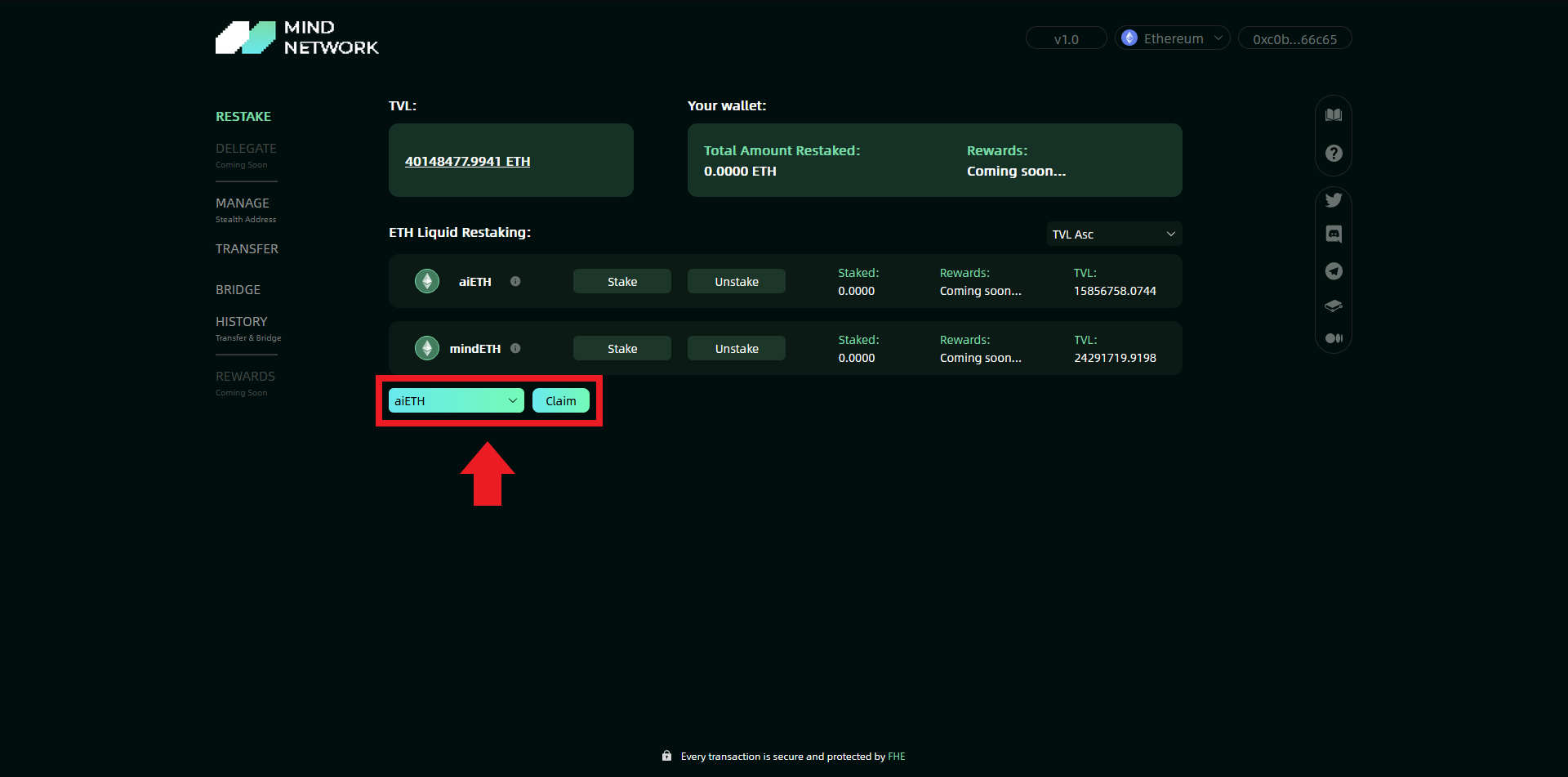 From here, we can mint some test tokens by selecting the drop-down and choosing "aiETH", then "Claim".