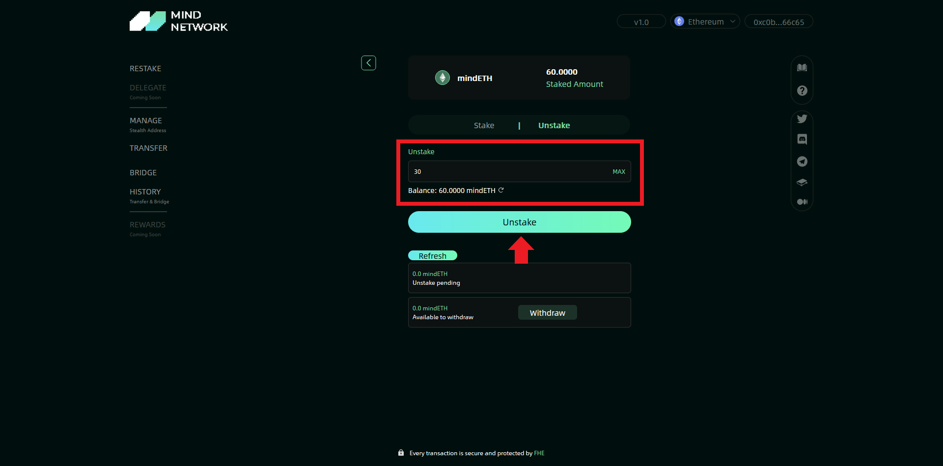 We can also Unstake funds too by pressing the "Unstake" tab and inserting an amount and pressing "Withdraw".