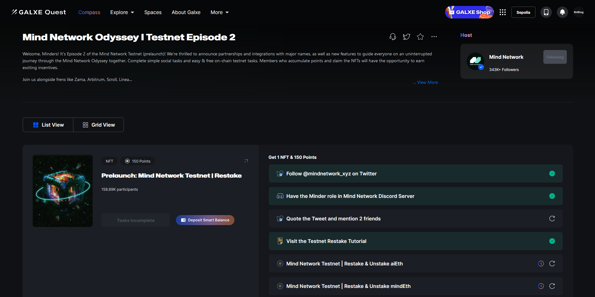 Finally, let's go to the Galxe Campaign and complete as many of the tasks as possible, the testnet interaction tasks should already be marked as completed.