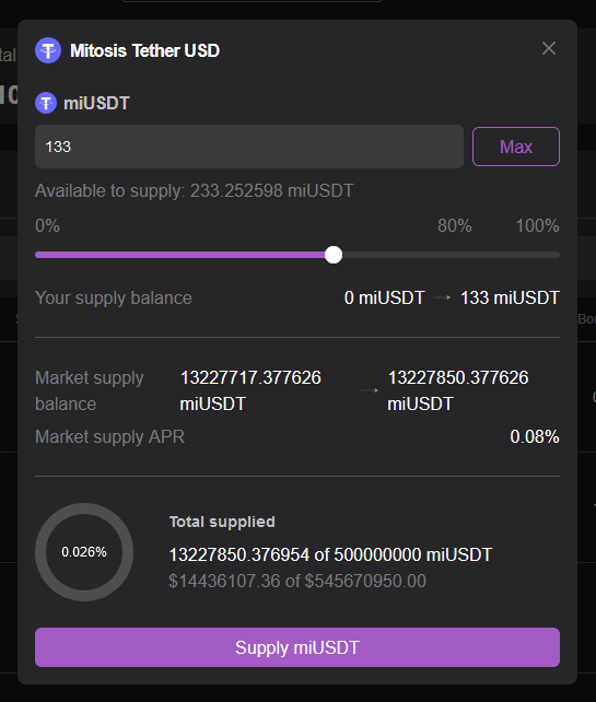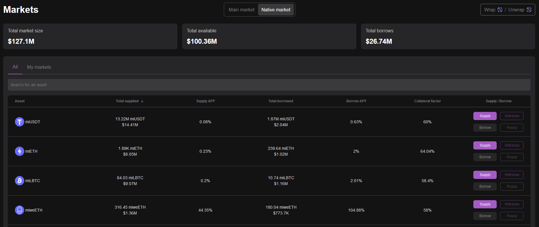 Then select the "Native Market" tab at the top and press "Supply" on the first token (miUSDT).