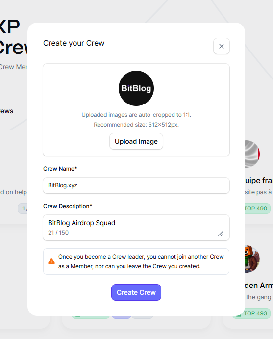 Here you can either create your own crew, or you can join our crew: BitBlog Airdrop Squad.