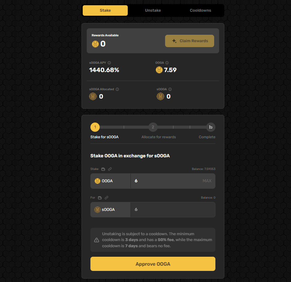 Insert any amount of OOGA, hit "Approve OOGA" and then confirm transaction with wallet.