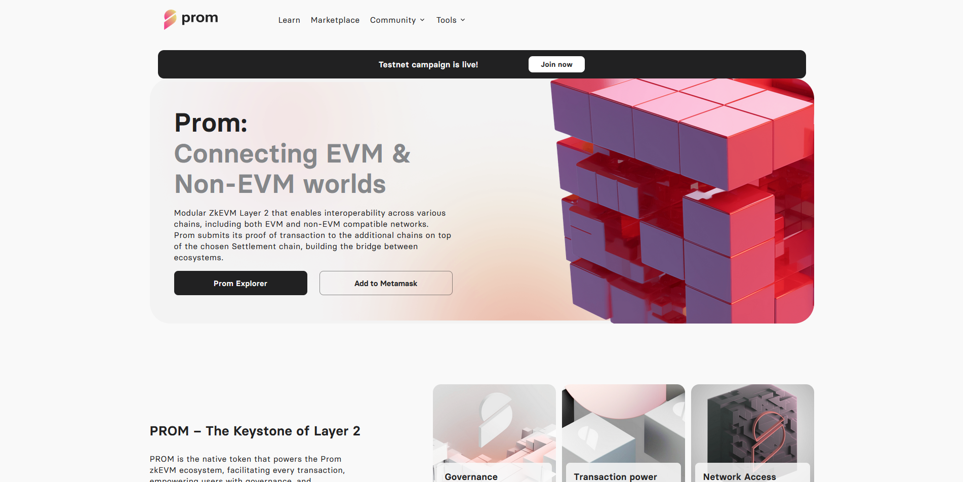 Prom Network is a blockchain ecosystem powered by Polygon, utilizing zkSNARKs technology to reduce transaction costs significantly. It operates as a ZkEVM Layer 2 solution, allowing interoperability among different blockchain networks, including both EVM and non-EVM compatible chains. Prom submits transaction proofs to additional chains alongside the chosen settlement chain, facilitating connectivity between various ecosystems. PROM serves as the native token within the Prom zkEVM ecosystem, enabling transactions, governance participation, and incentivizing community engagement.