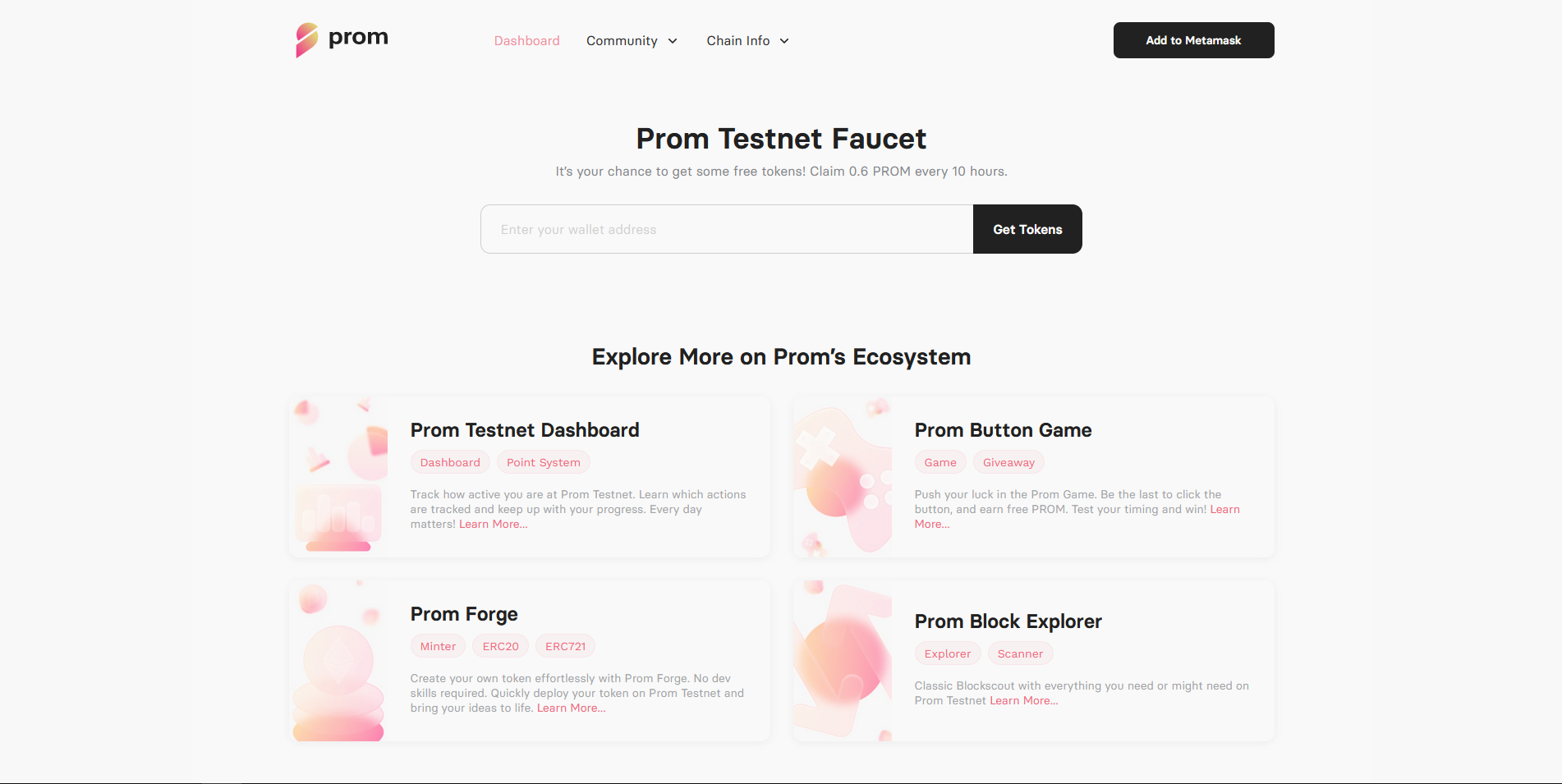 Add Prom Testnet to your MetaMask wallet by pressing the "Add to MetaMask" button.