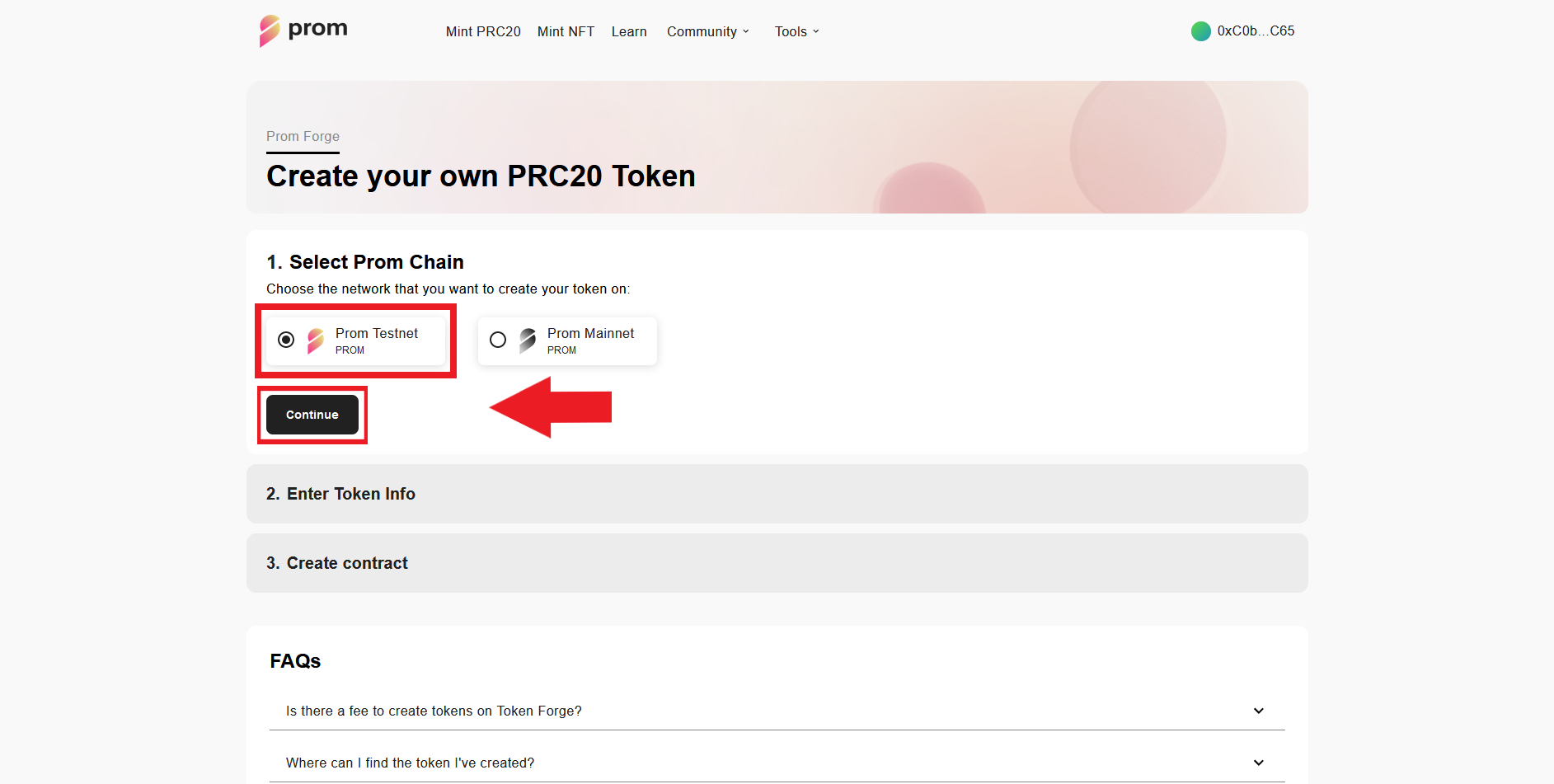 To do this, go to Prom Faucet, insert your MetaMask wallet address and press "Get Tokens".