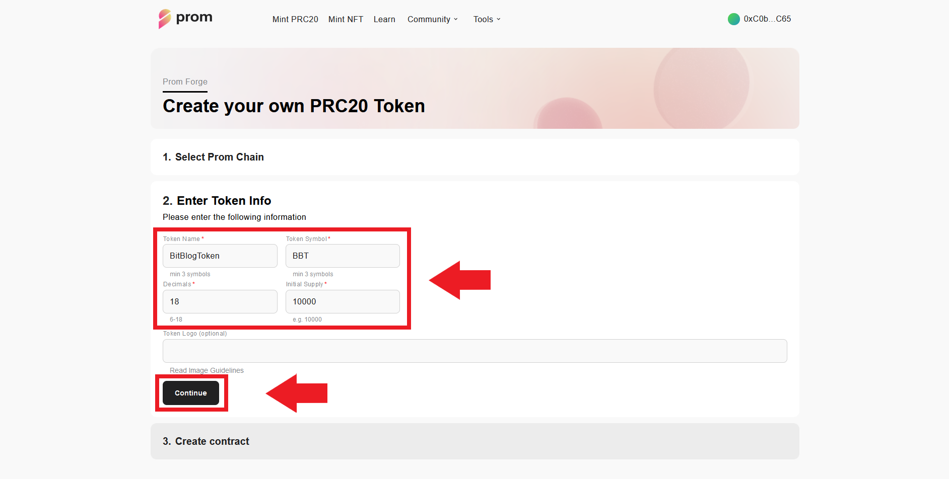 Now enter token information such as: name, token symbol/ticker and the supply amount, then hit "Continue".