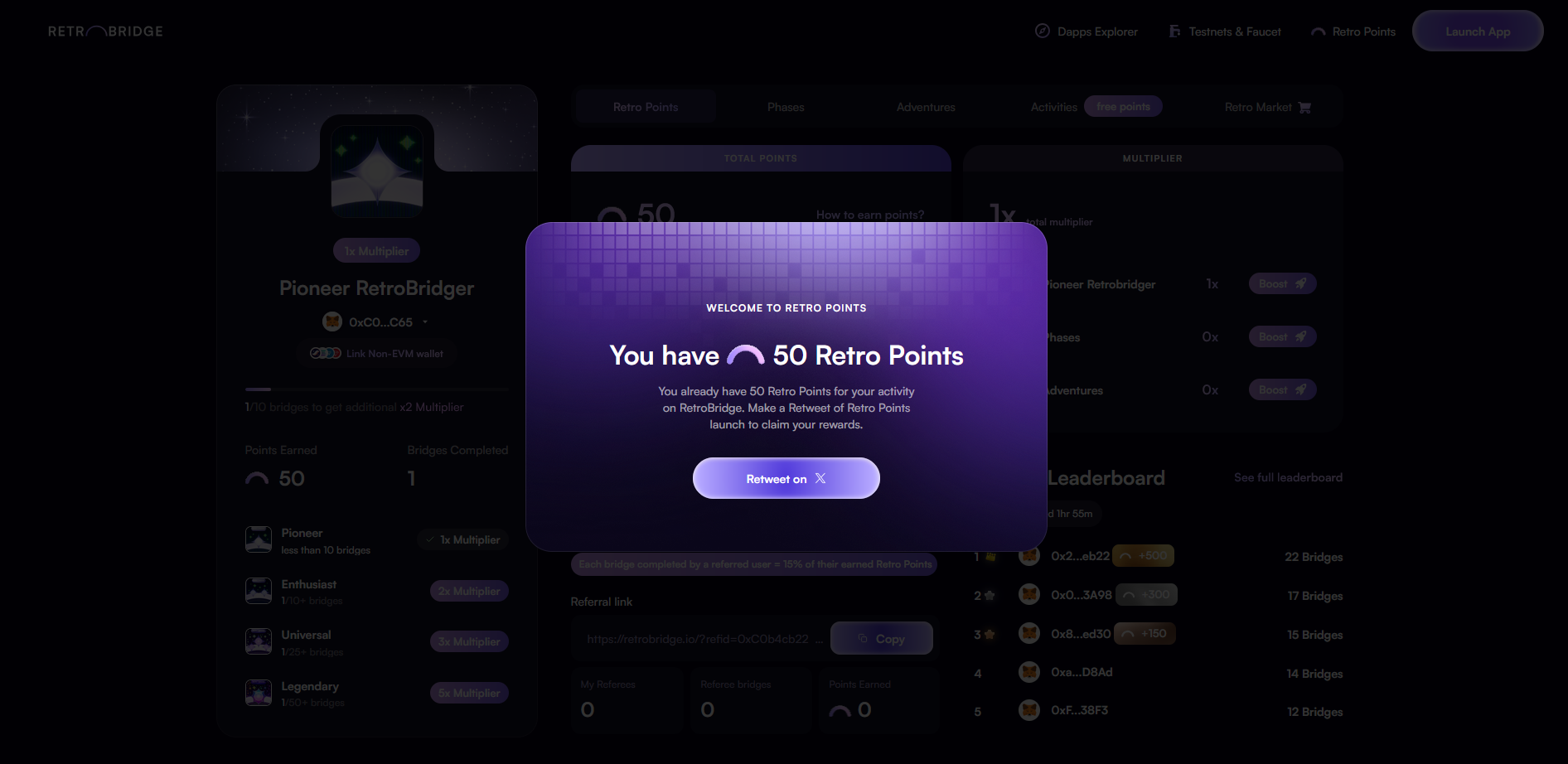 If you'd like to use the Retrobridge faucet for a chance of earning extra points, then we'll need to perform a bridge on mainnet to unlock it. If not, you can skip to step 3.