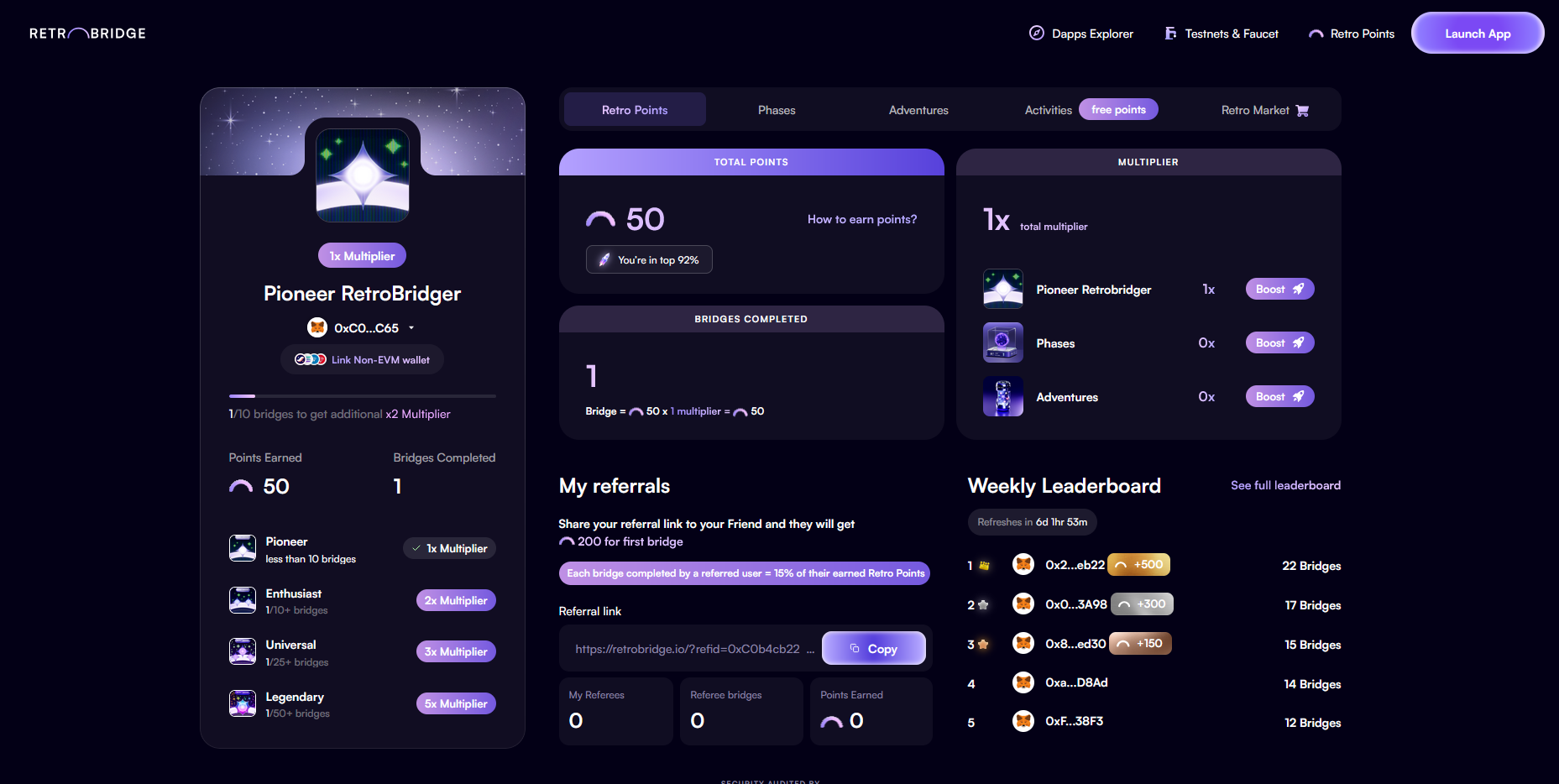 In your profile, you can see your total points, keep up-to-date with your activity, and view some other things like your referral link and the weekly leaderboard.