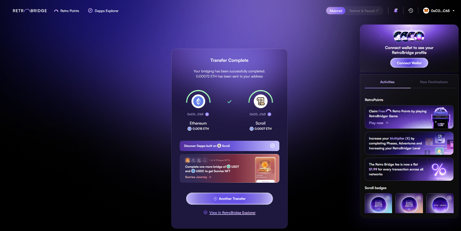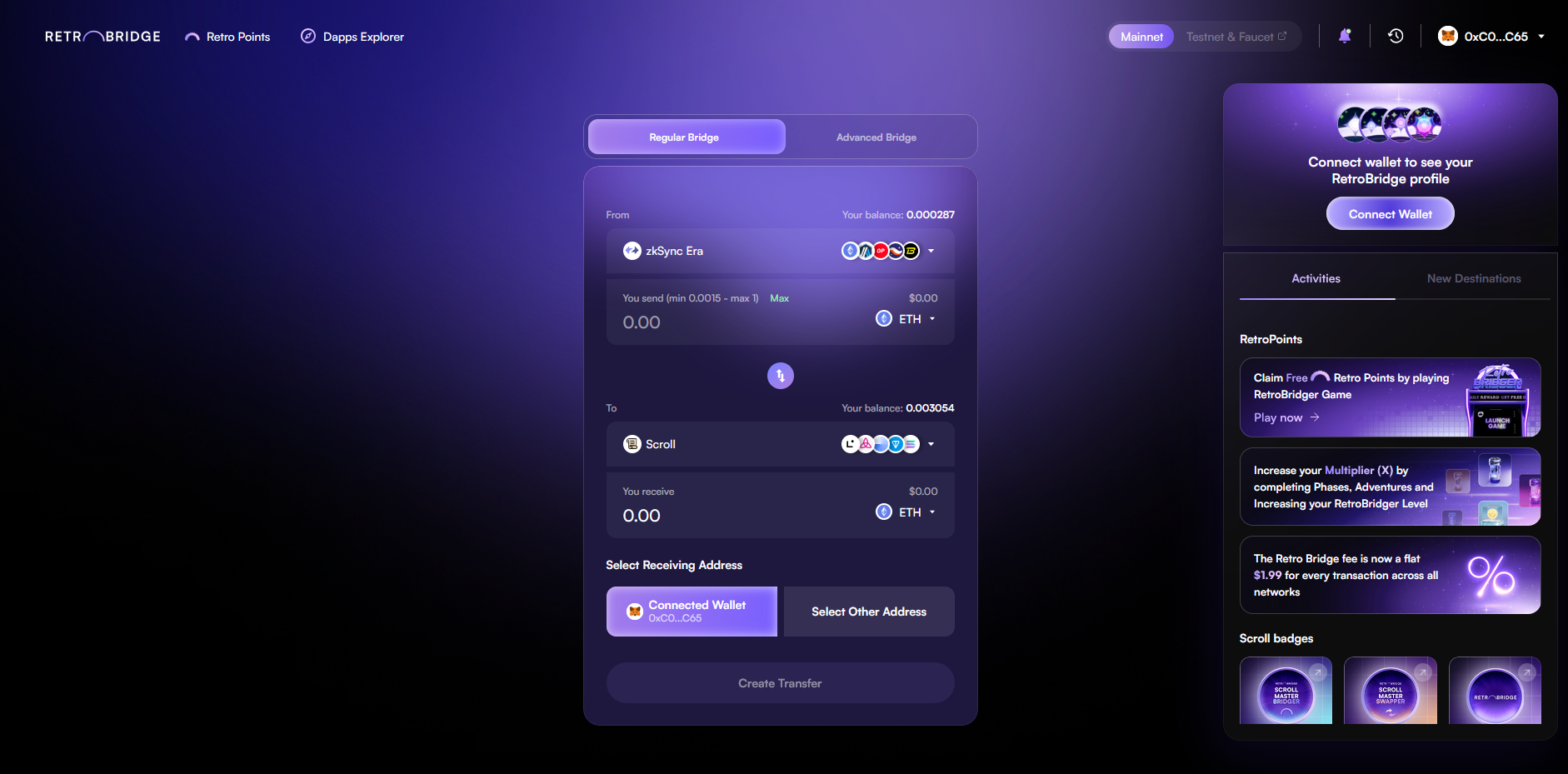 Now we just need to bridge a small amount of ETH. Retrobridge supports most networks like Base, Arbitrum, zkSync Era, Scroll, OP & more.