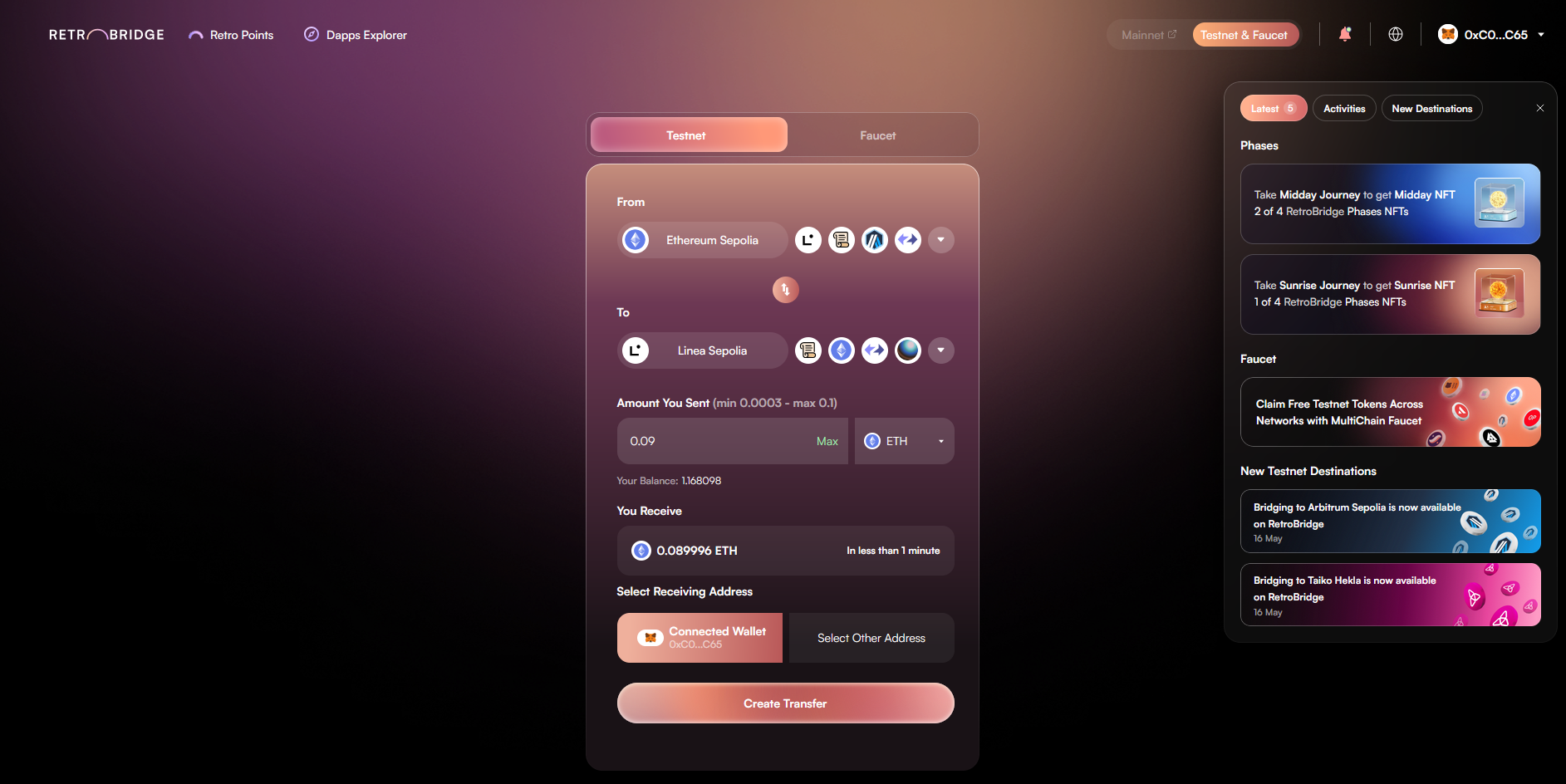 Next, we need to make use of the bridge: testnet.retrobridge.io