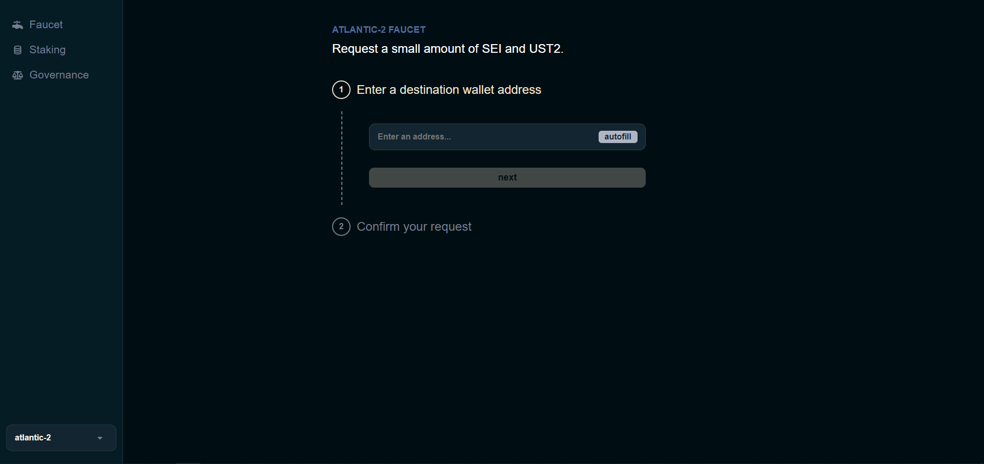 Go to app.seinetwork.io/faucet, insert or auto-fill the wallet address box and hit "next".