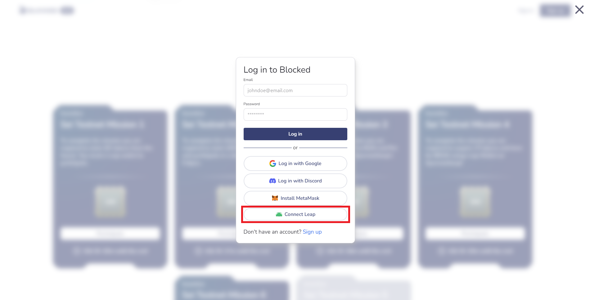 Go to edge.blocked.cc/products/1 & click "sign in", then select "Connect Leap", This will sign you in with your wallet.