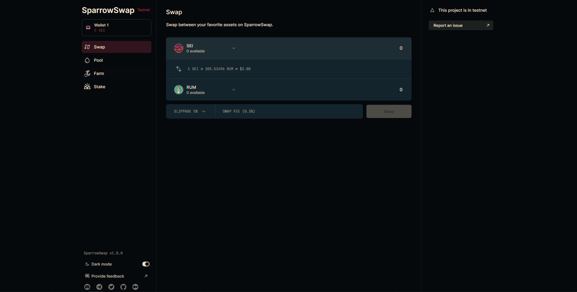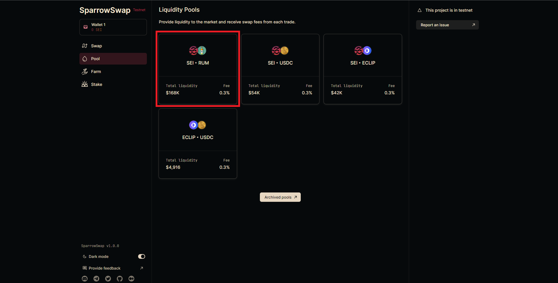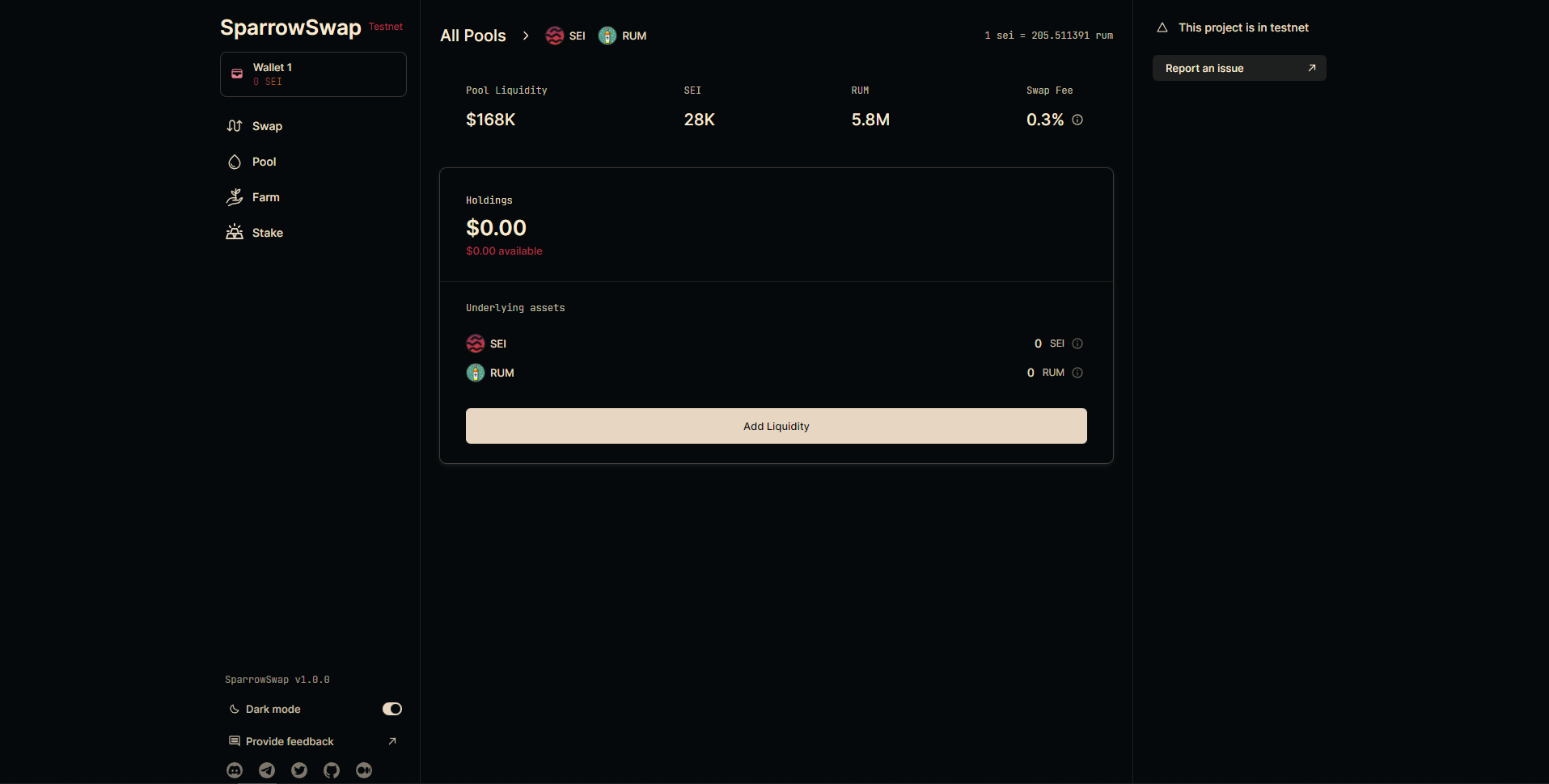Lastly, we need to put over 0.1SEI into SparrowSwap’s Sei-RUM pool.
