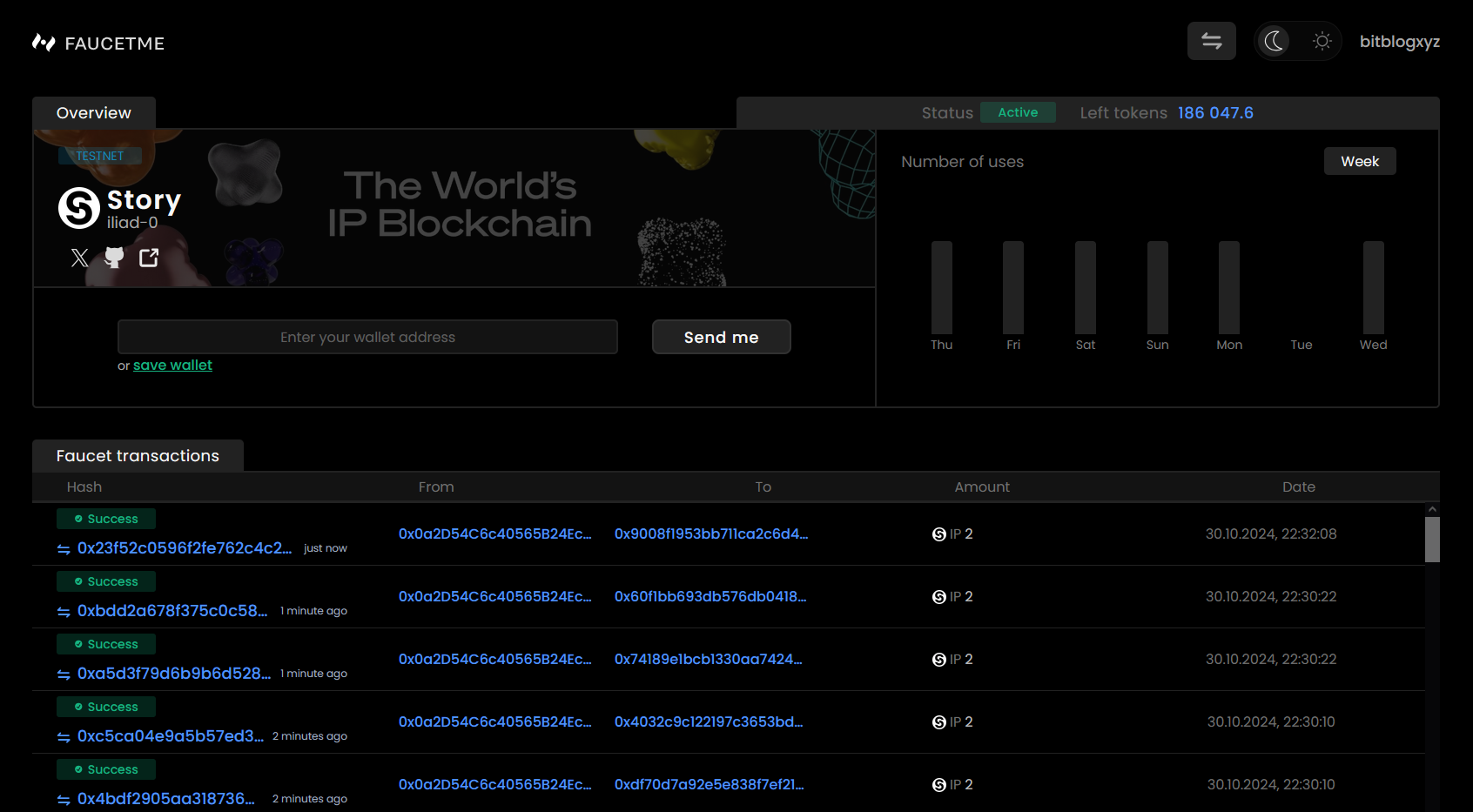 Now we can insert our wallet address and press "Send me" to receive some IP tokens.