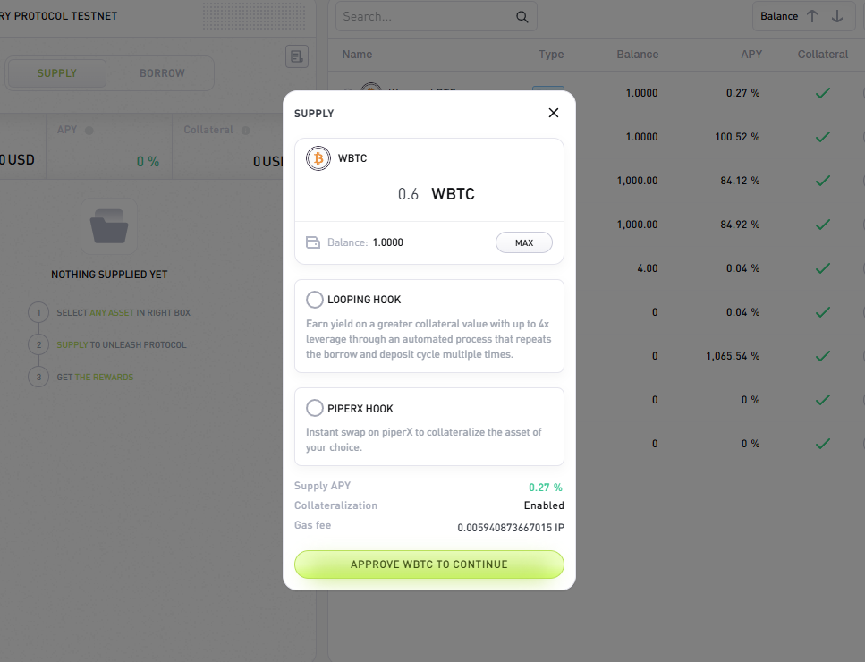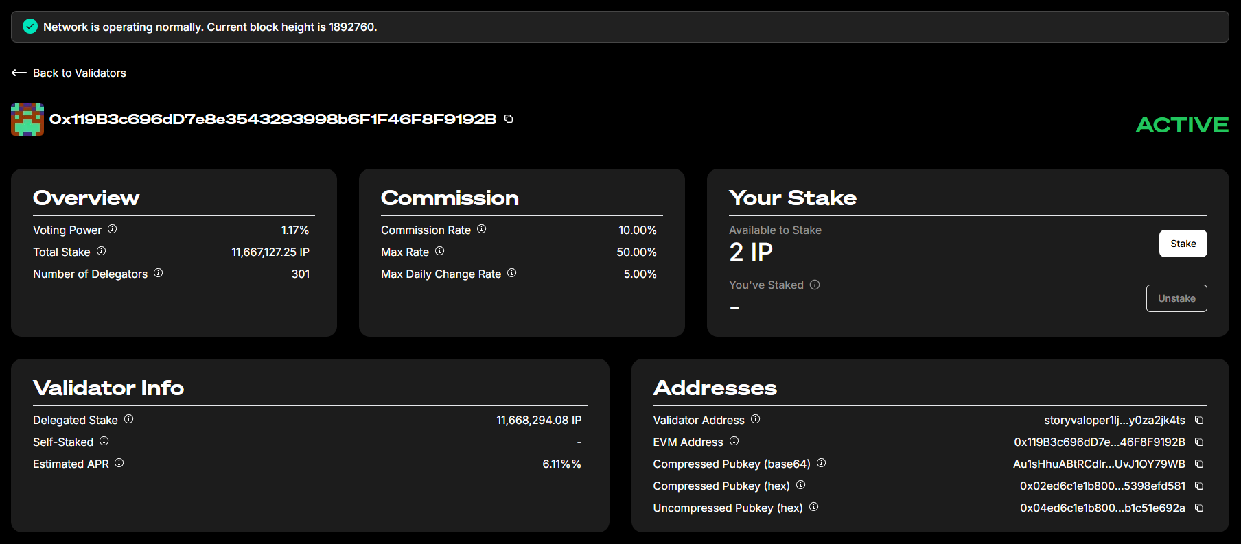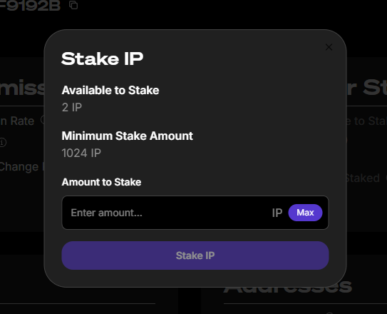 Now press "Stake", insert the minimum required amount of IP and hit "Stake IP".