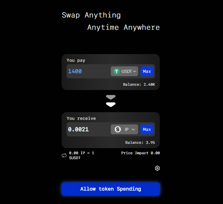 Now just select any tokens to swap between, input amounts and press "Allow Token Spending", when the wallet pop-up appears set the spending cap to the amout you want to use, so in our case it would be 1,400 because in our example below we are swapping 1400 USDT.