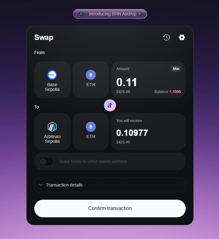 Set the "From" as Base Sepolia and set "To" as any network of your choice, then input an amount that's over the minimum required amount.