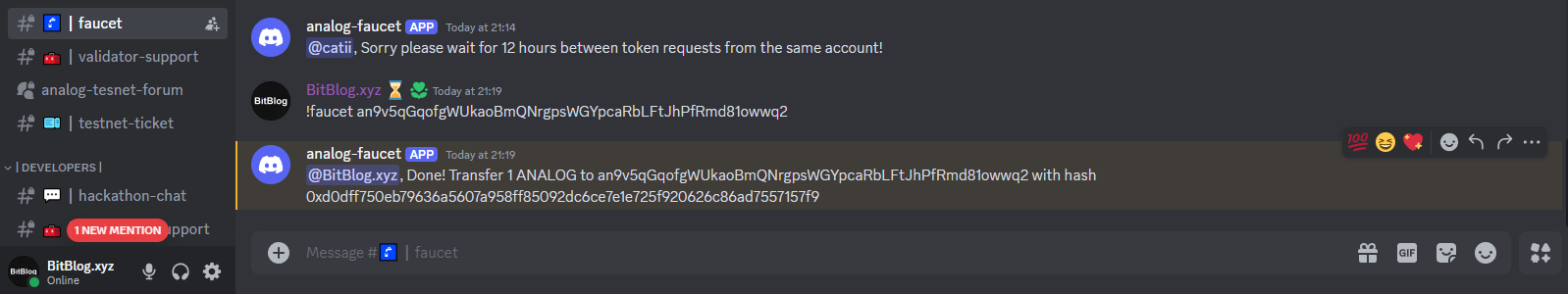 In the Analog Discord server, head to the faucet channel and type: !faucet YOUR_TALISMAN_ADDRESS