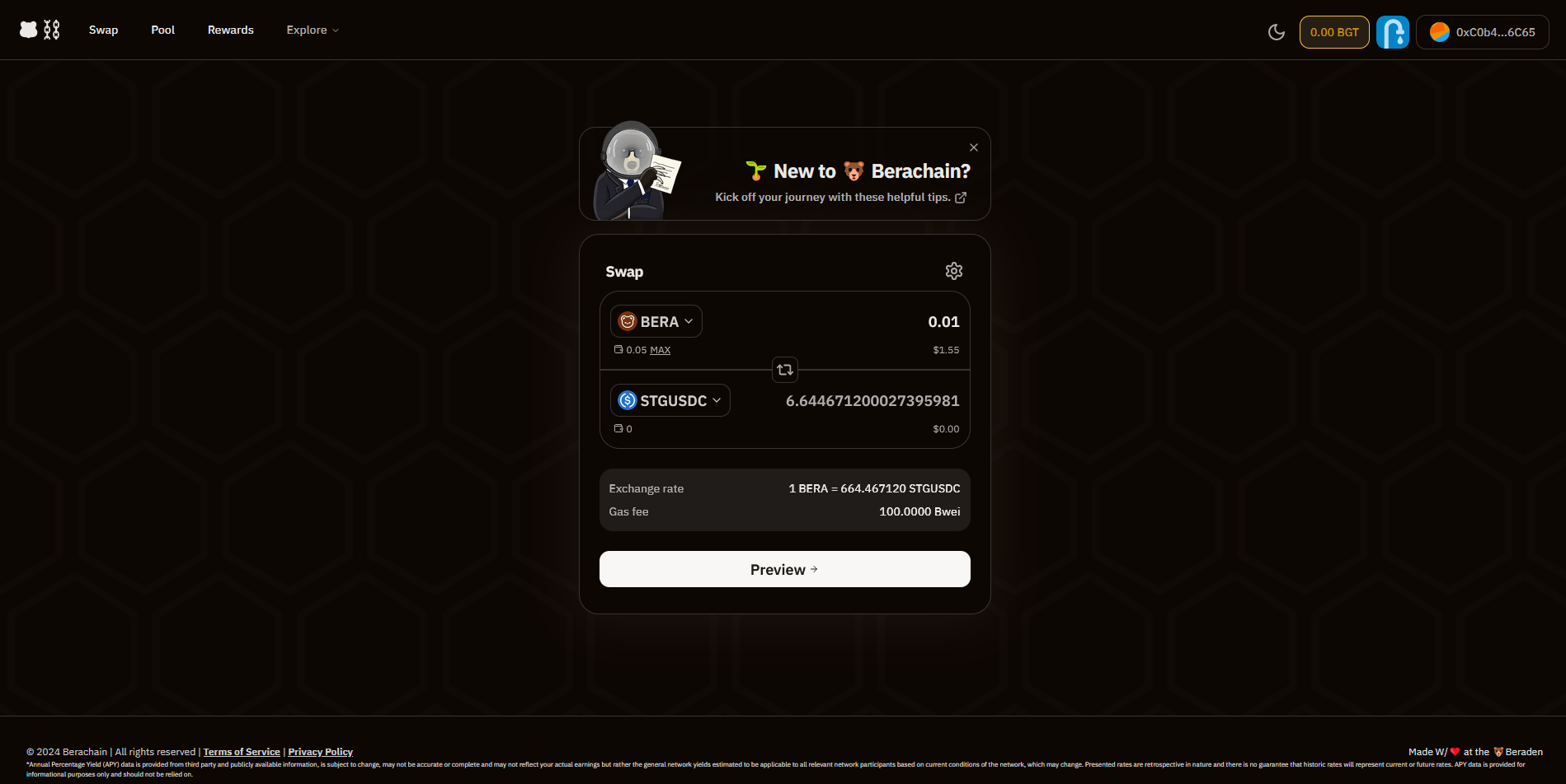 Now set the first token as "BERA" and the second token as "STGUSDC"