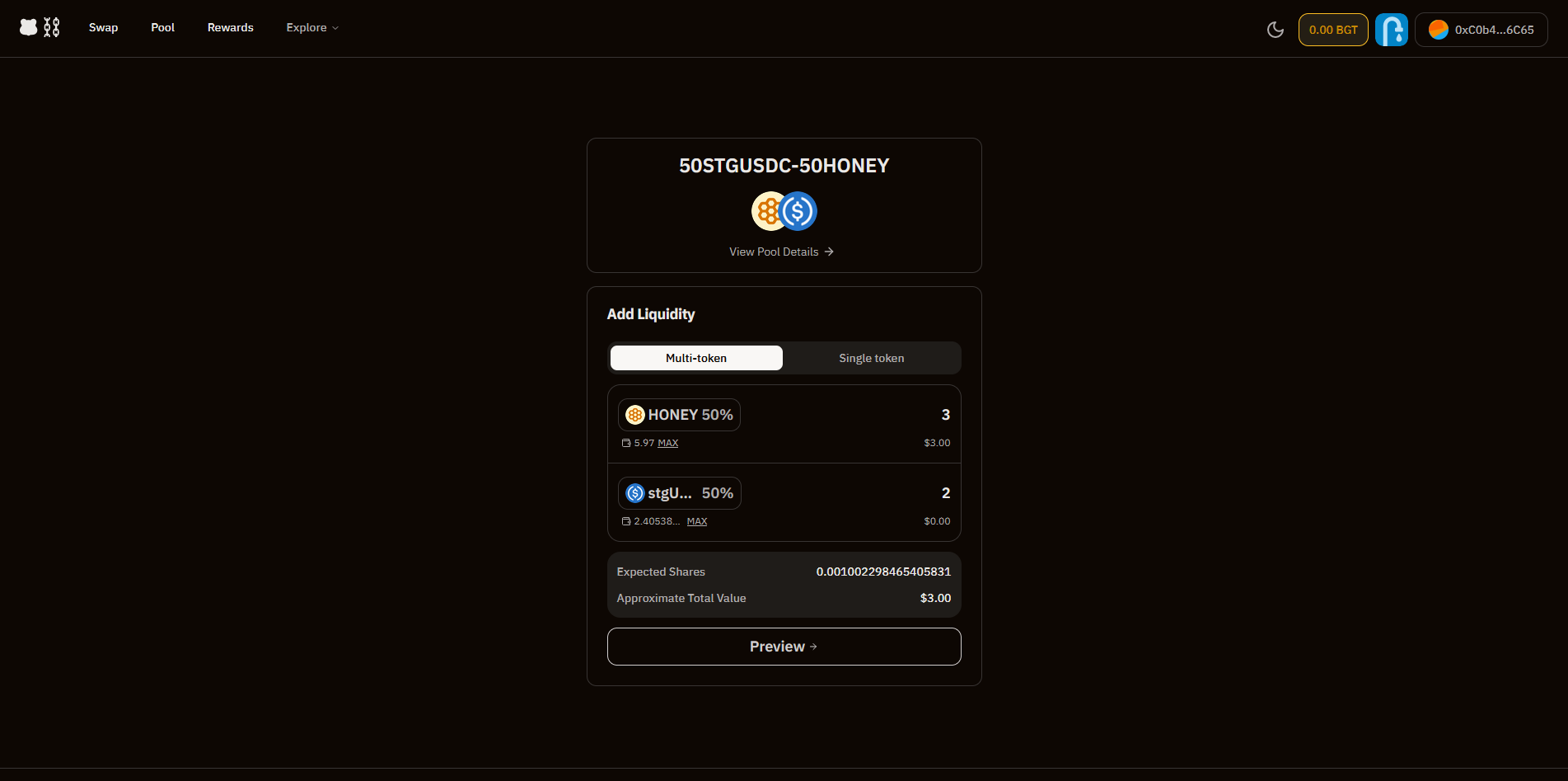 Insert any amount of each token and click "Preview", then "Approve HONEY", "Approve stgUSDC", and finally "Add Liquidity".