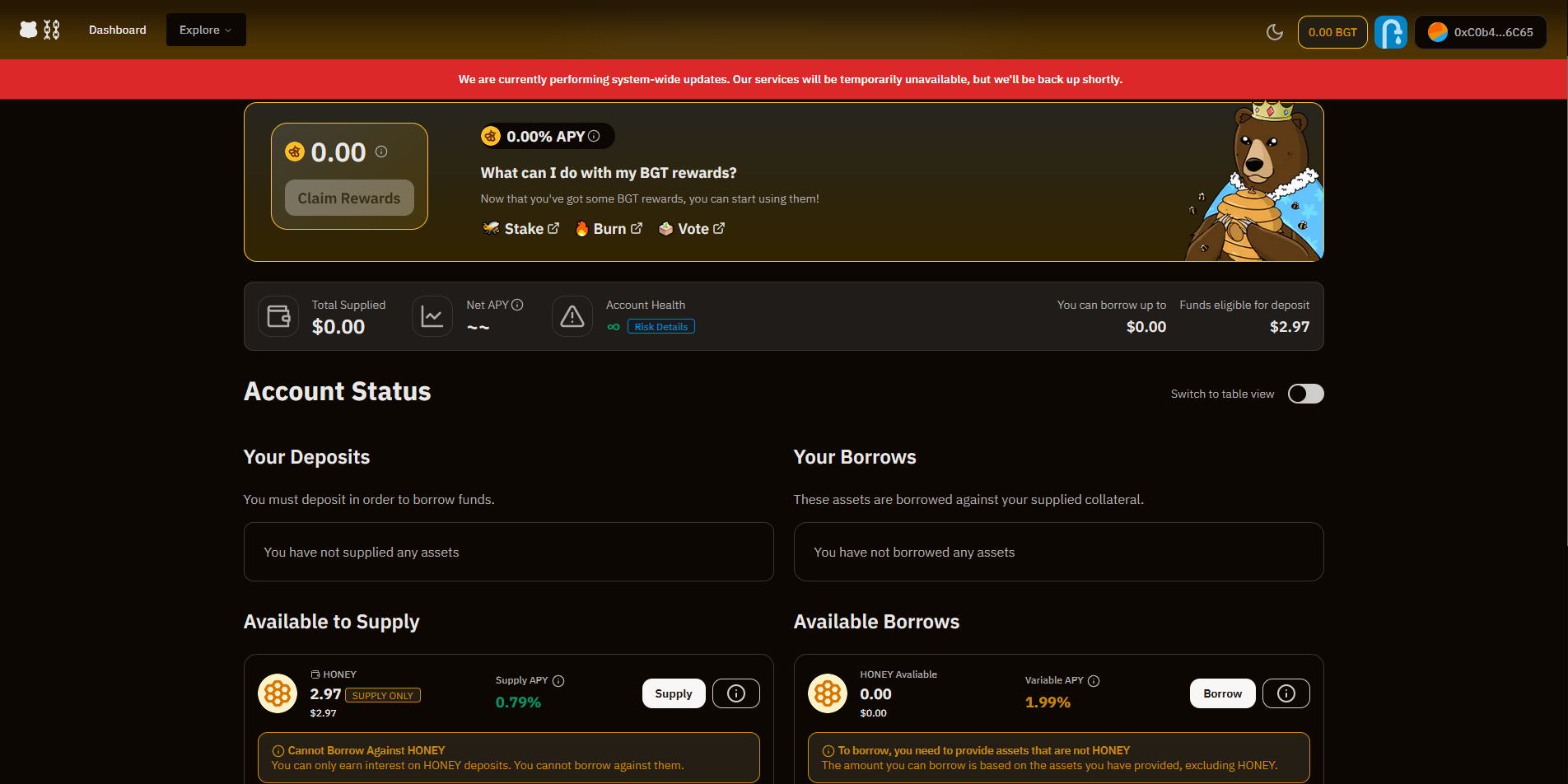 Scroll down and click "Supply" on HONEY, enter an amount, approve and confirm transaction.