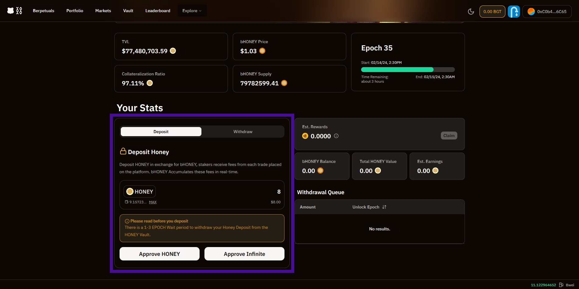 We should also select "Vault" at the top and deposit HONEY.