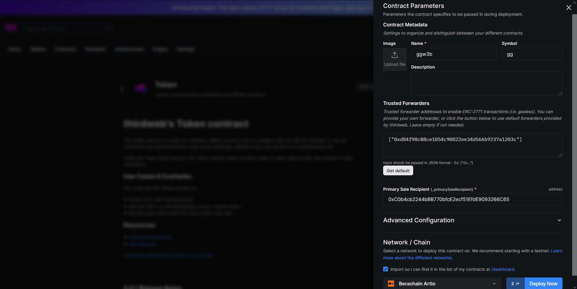 Press "Deploy Now", fill out some information such as token name, image (optional) and set the "Primary Sale Recipient" as your own wallet address.