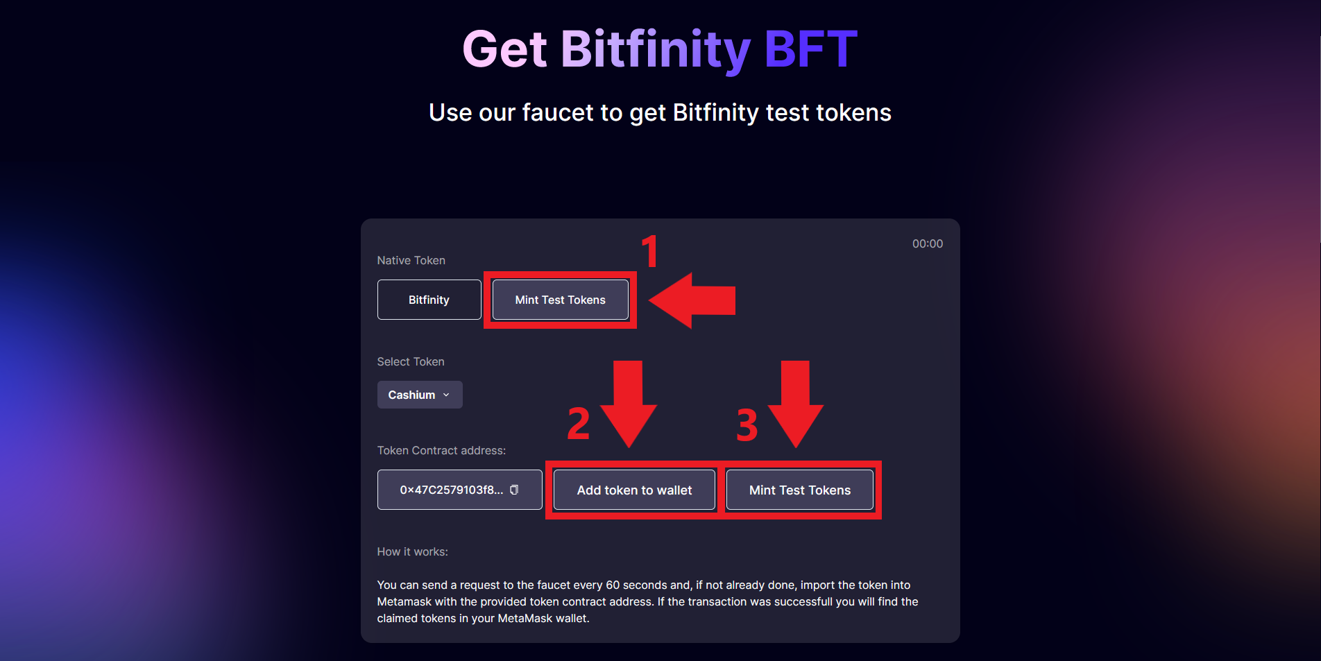 First, click "Mint Test Tokens" this will add the network to your MetaMask wallet, we then have to press the same button again to actually claim some of the BFT test tokens.
